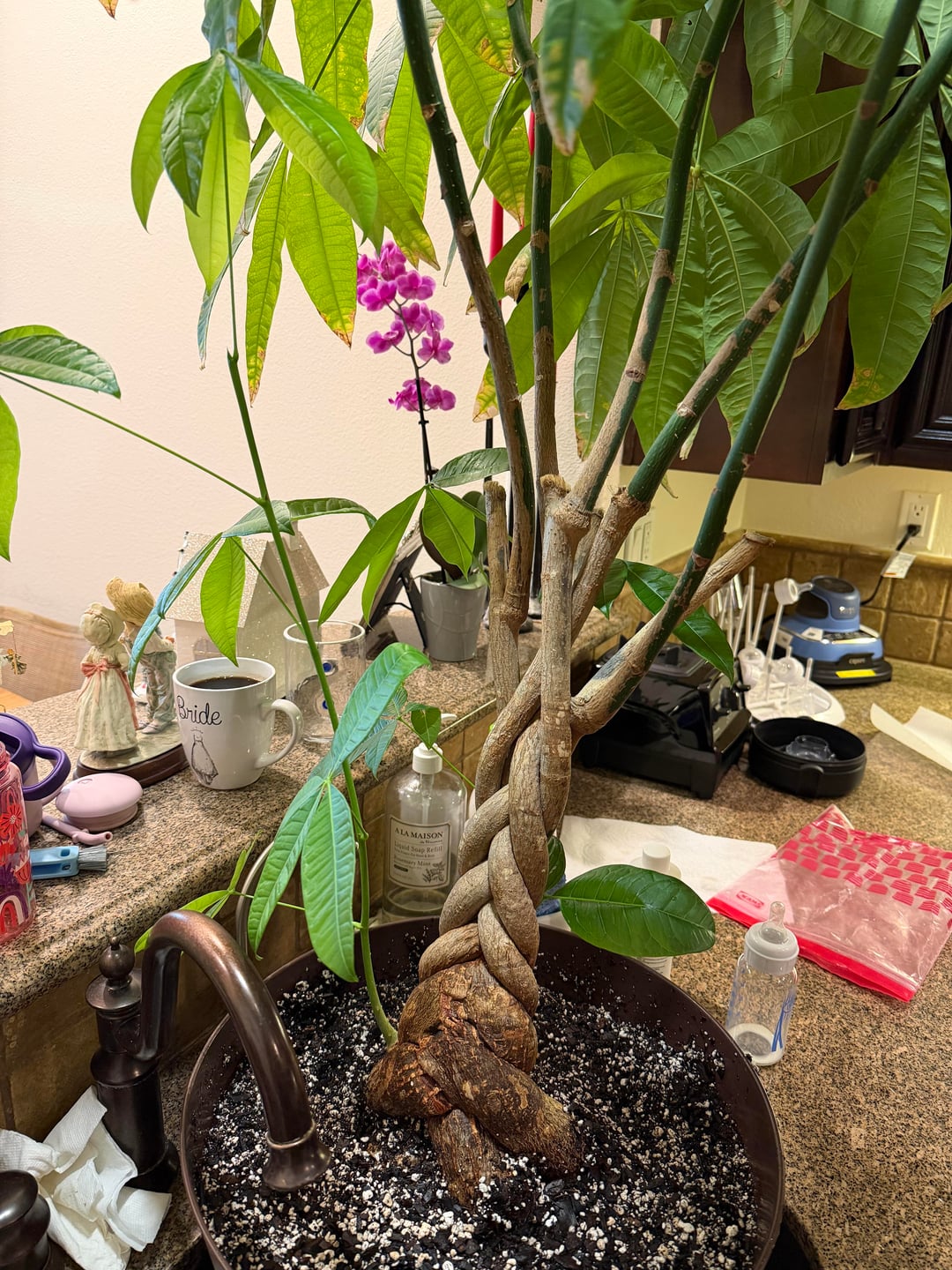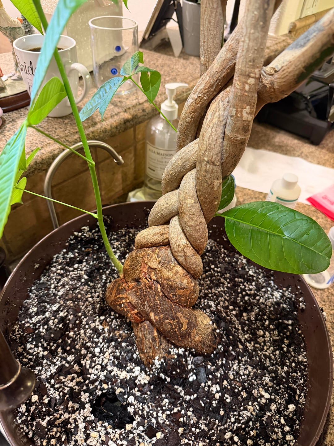 こんにちは、ここで何をすればいいのかわかりません。トリミングしたほうがいいでしょうか?このまま成長させたほうがいいでしょうか? 3本の枝を取り、それらを絡み合わせて樹皮を上に向けたままにする必要がありますか?ヒントがあれば助かります、ありがとうございます。他に水やりするスペースがないので、キッチンのシンクで水やりしています。