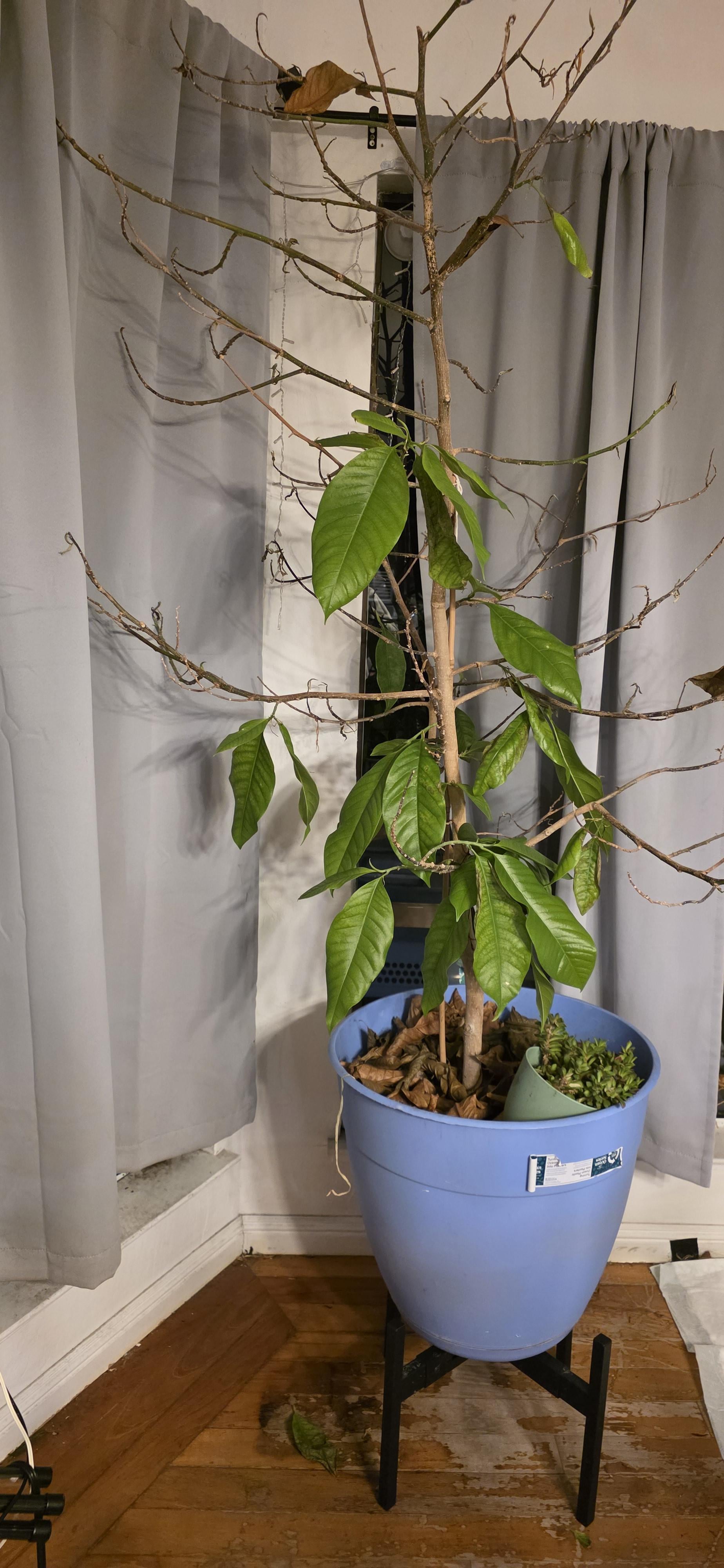 3年生のマグノリアアルバです。 3フィートくらいのところでゲットしました。天井に当たらないように上置きしました。今は6フィートくらいです。夏には花を咲かせてくれます。今年は寒かったので少なめです。それは生涯ずっと屋内の木でした。かなりうまくできました。アブラムシもアザミウマも(葉の3/4を剥ぎ取らなければならなかった)生き残っています。冬には室内温度が60度台前半まで下がります。植物としてはかなり穏やか。寒くなると葉を落とします。屋外に植えると、40度台前半まで下がります。この種類の木はこの低温にも耐えることができます。私の保護された木についてはわかりません。