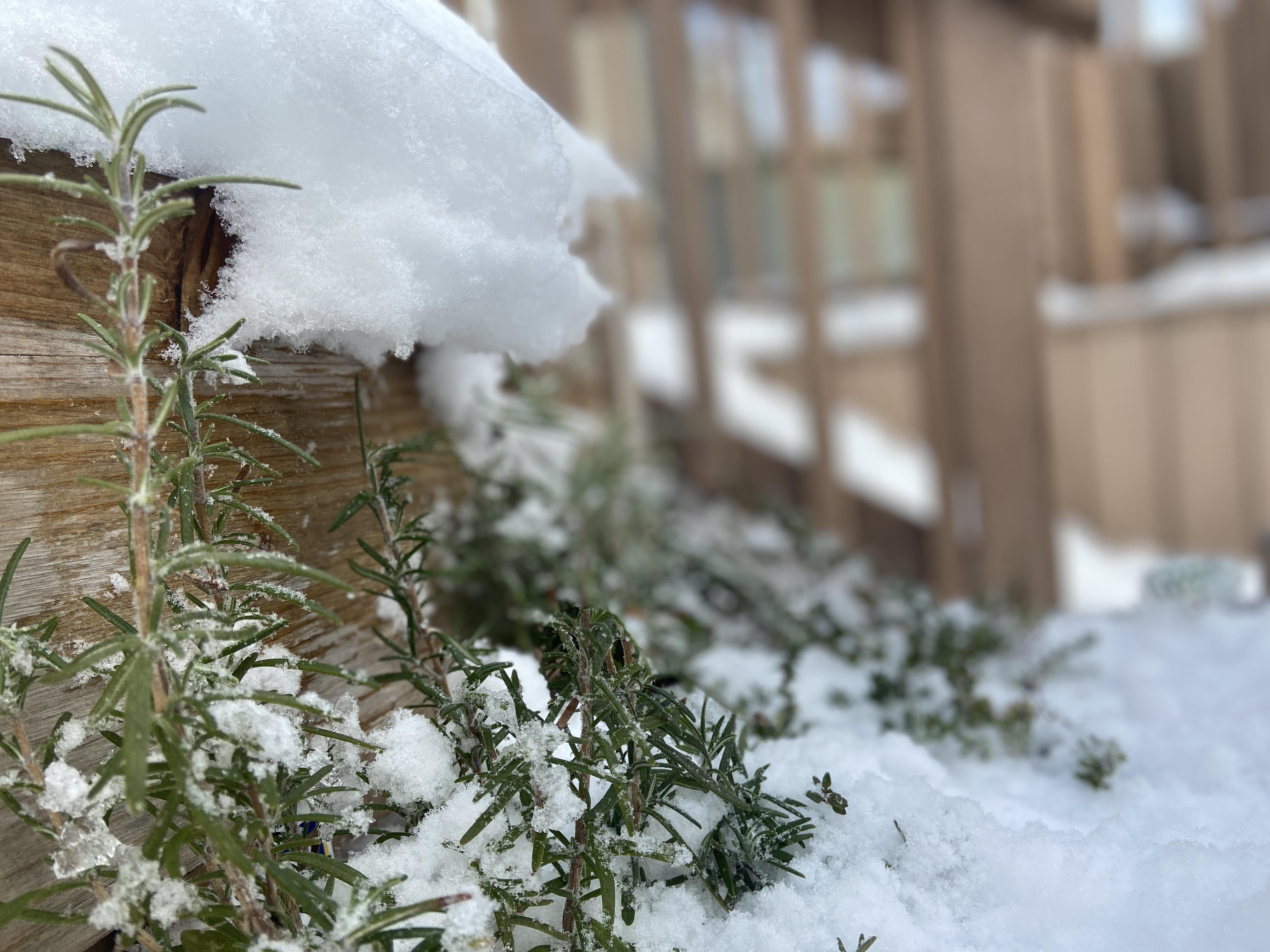 雪の降る冬、つるに凍った新鮮なローズマリーとタイム