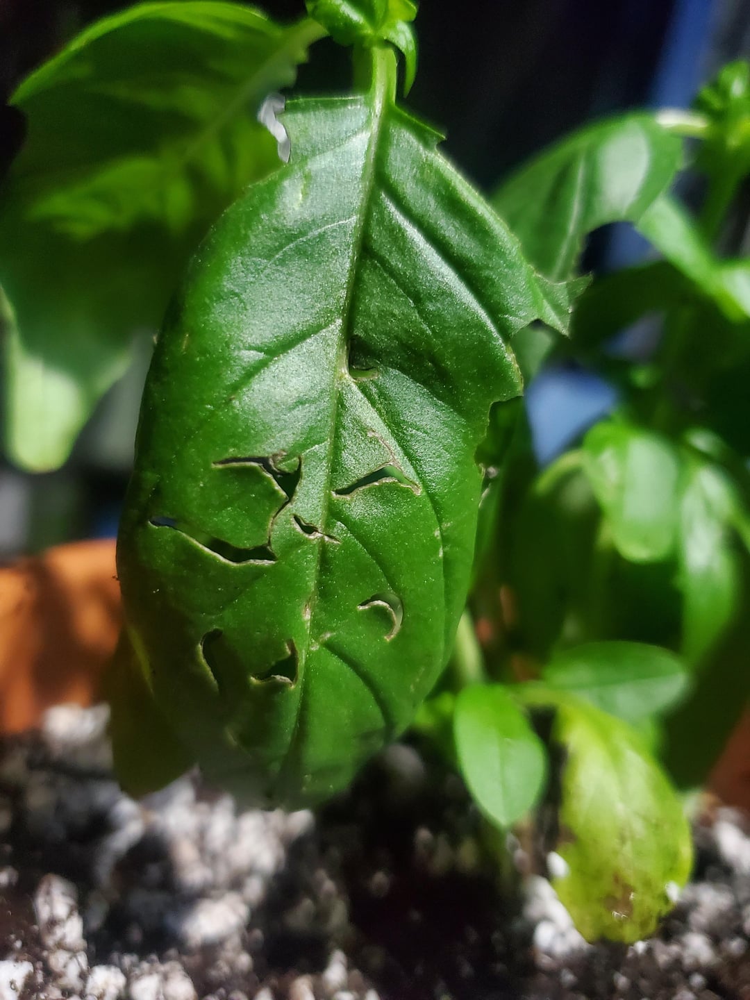 私の猫の1匹は植物を食べるのが好きですが、実際にはバジルの香りが嫌いなので、それが彼ではないかと疑っています。さらに、彼の噛み跡のようには見えません。それが役に立ちます、この植物は米国フロリダ州のパティオの遮蔽された場所に保管されています。 植物を守るために、それが何であるかを解明したいと思っています。