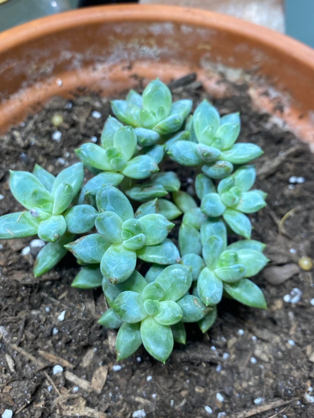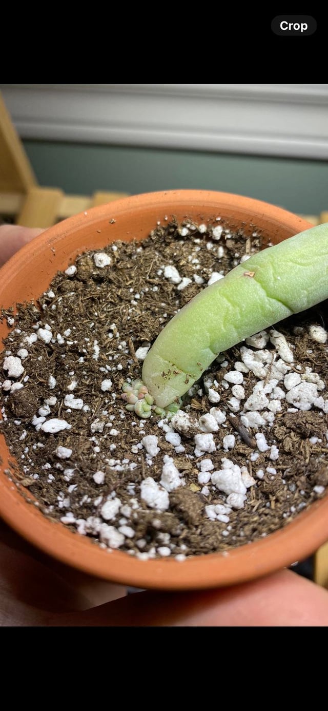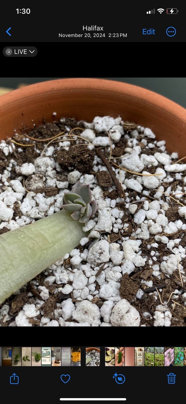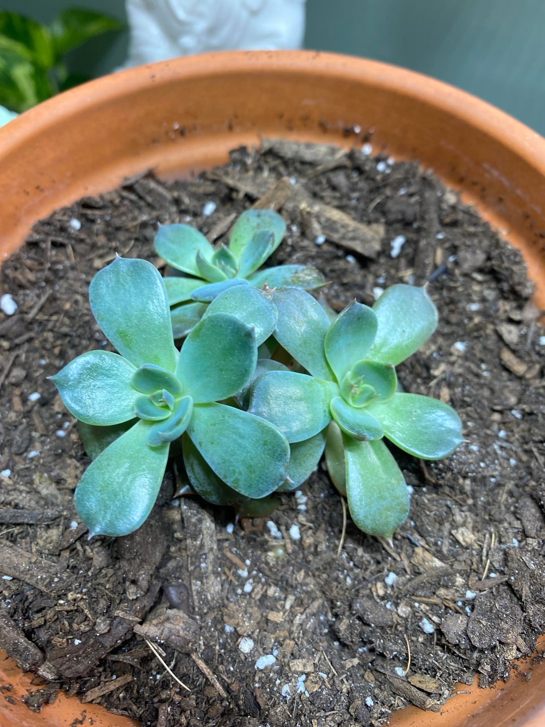 昨年の 12 月に床に落ちていたしわだらけの多肉植物の葉を地元の HD から拾い上げました。これが 1 年間の進歩です。私は月に1〜2回水やりをし、日中は栽培ランプを上部に置きます。