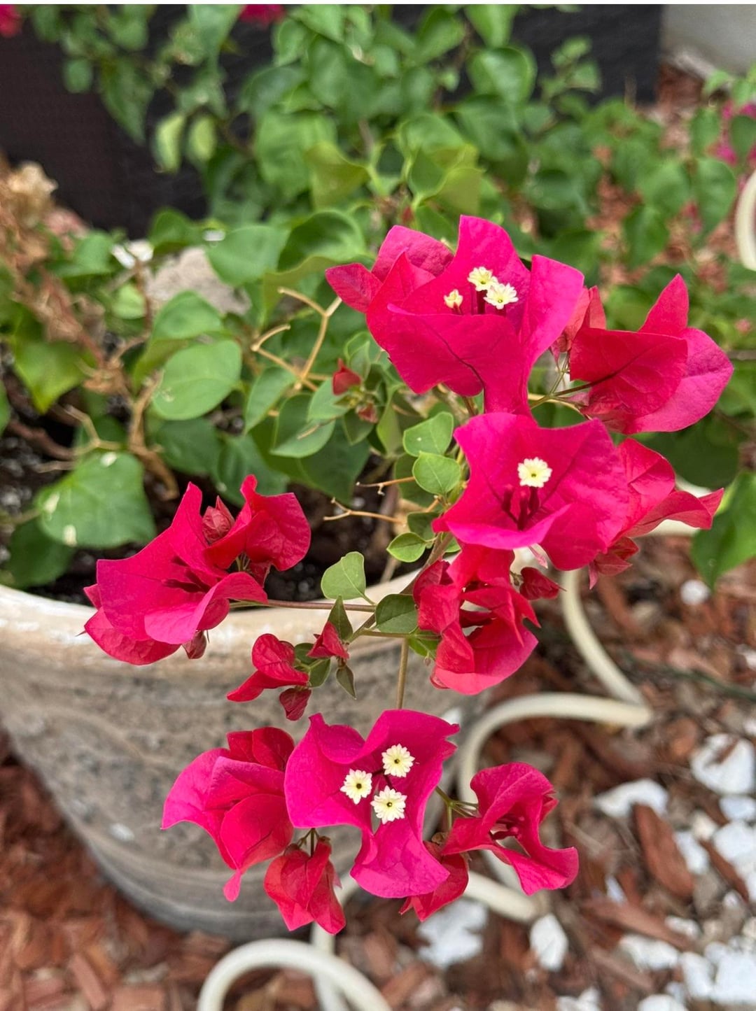 今日気づいたのですが、ブーゲンビルって季節によって花の色が違うんですね! 1枚目の写真は7月…2枚目は今日の写真です。 🤯🥰 同じ植物、同じ場所、同じ鉢。