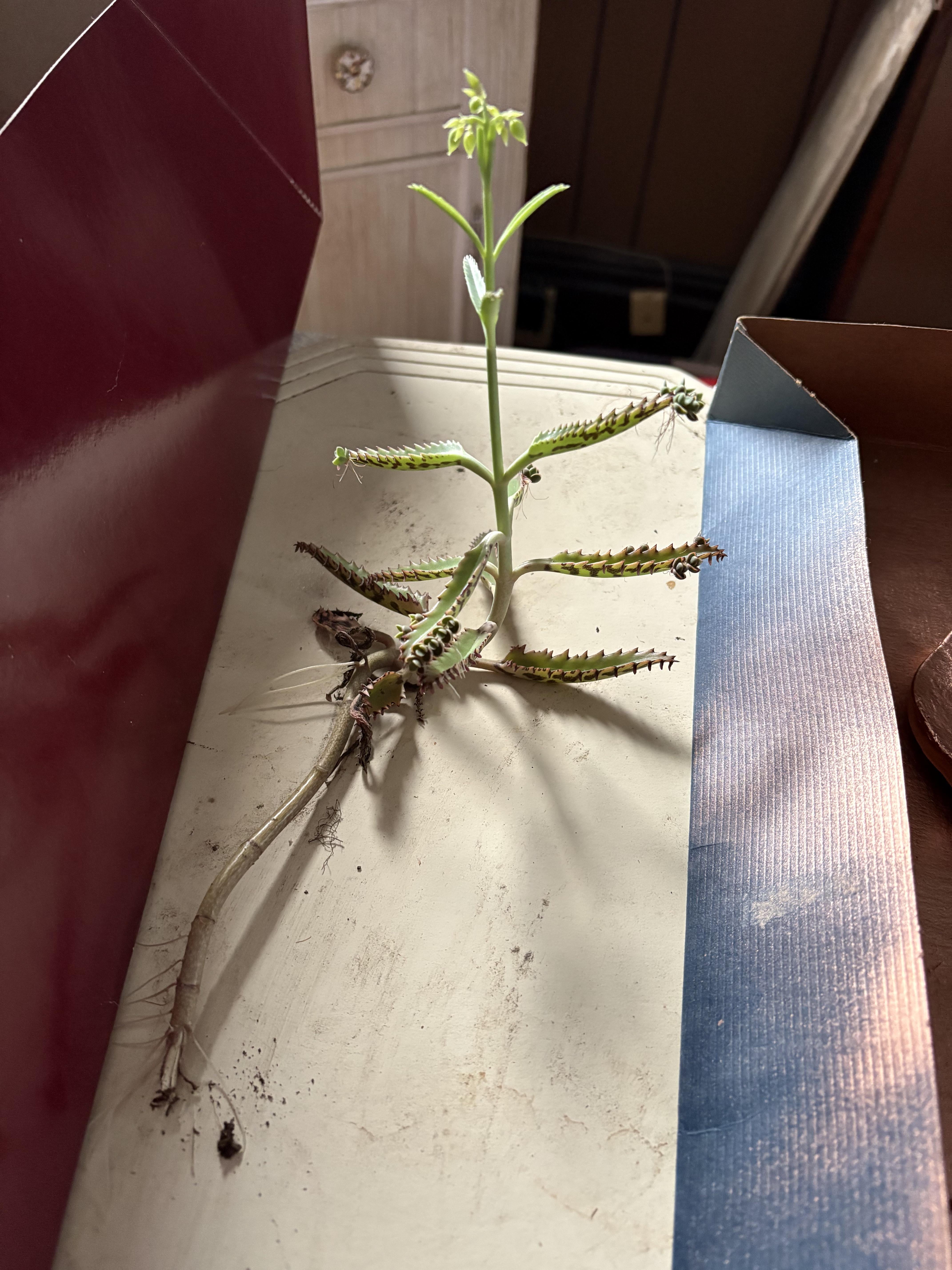 テーブルの上に置かれた何百万ものマザーのランダムな塊。約 8 か月間、土の中に置かれておらず、水も与えられていません。まだ生きているだけではなく、花が咲き始めています