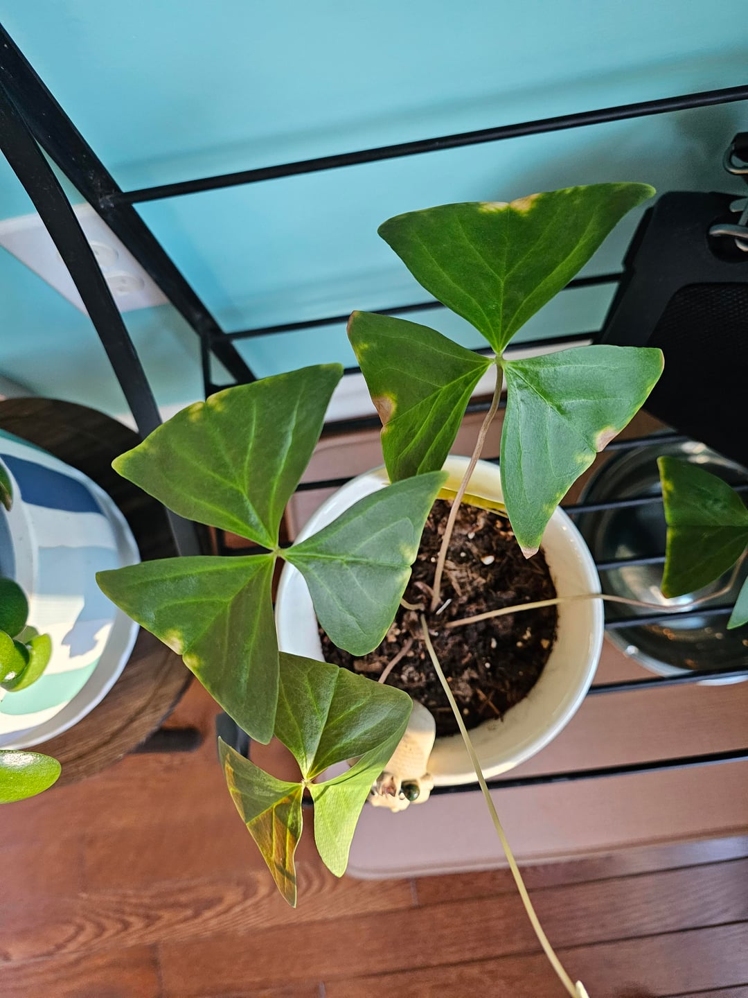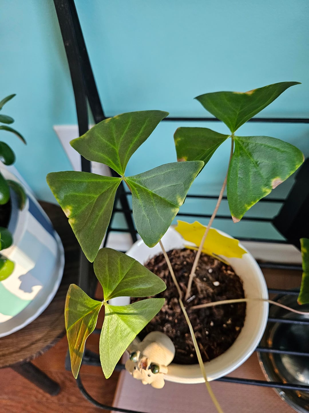 シャムロック/カタバミの植物の何が問題になっているのでしょうか? 4枚の葉のうち3枚に黄色い斑点があります。