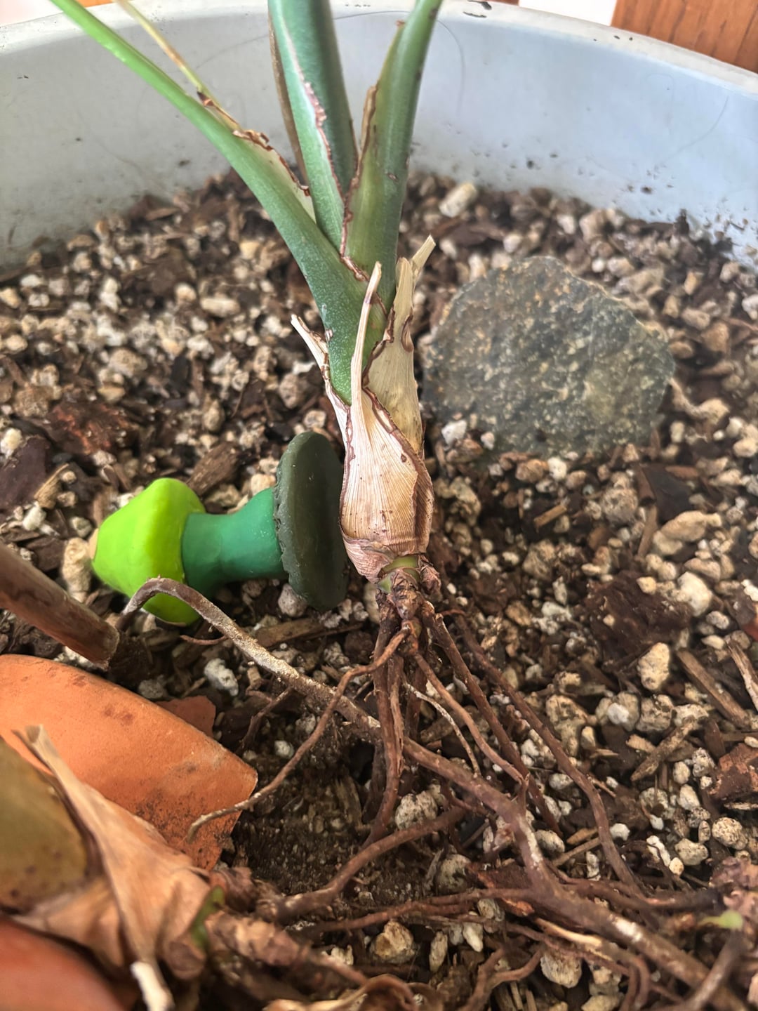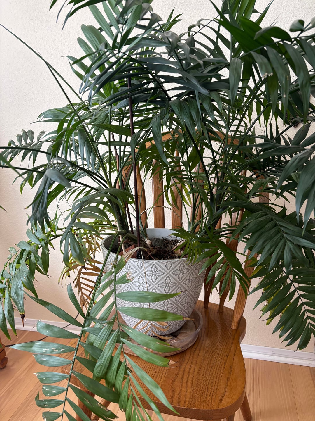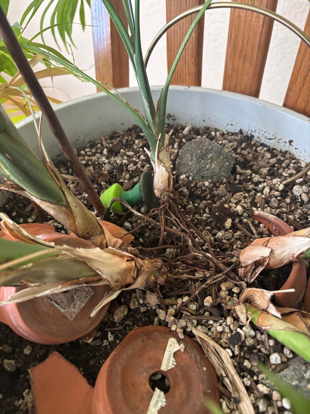 樹齢6年のヤシ。昨年植え替えましたが、各幹が土からはみ出してしまいました。手のひらの幹をどこまで埋めればよいでしょうか?この春はもっと深いポットに投資するつもりです。手のひらを上に向けるためのヒントは他にありますか?