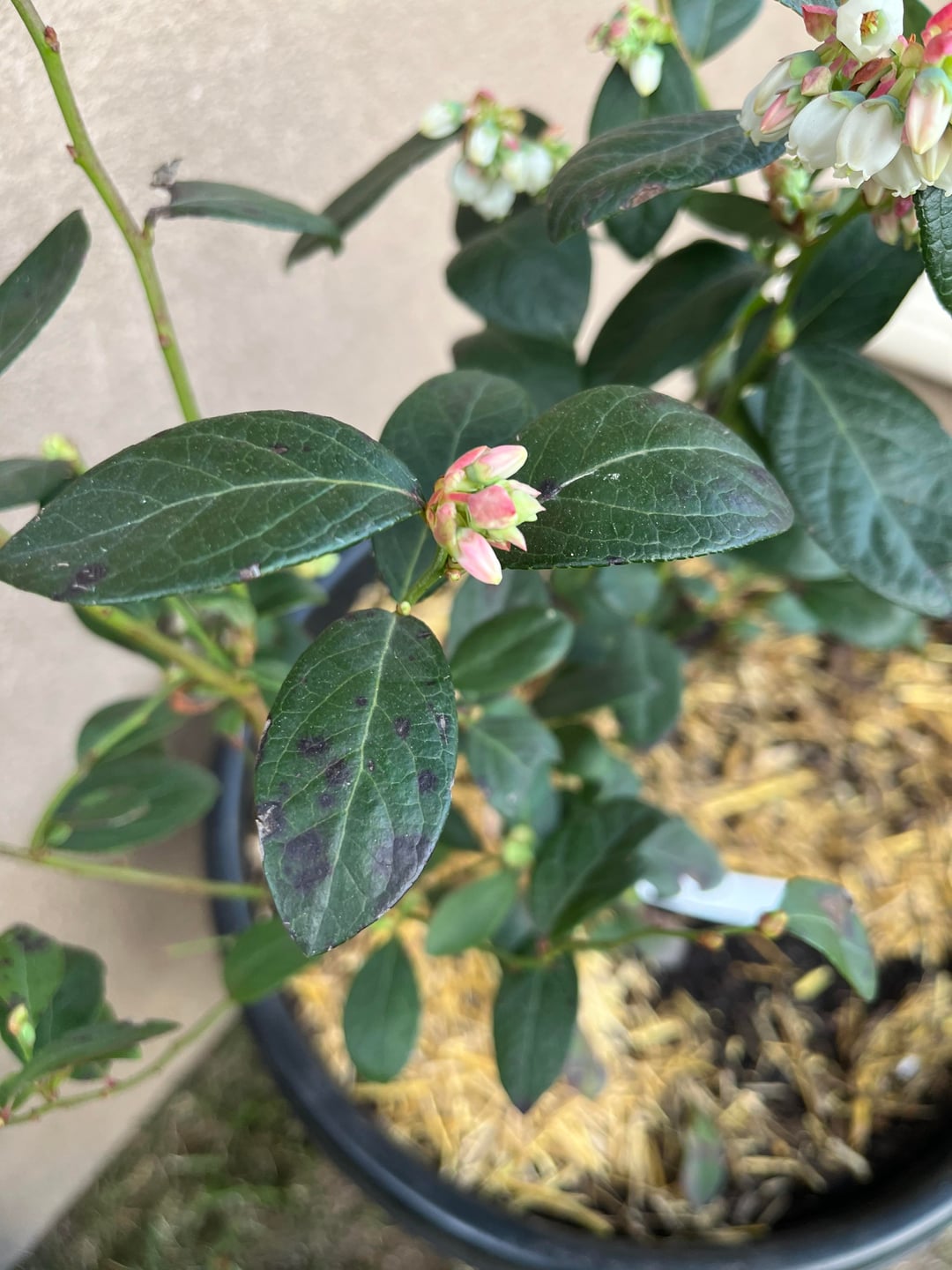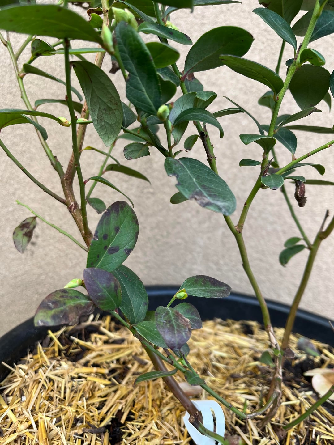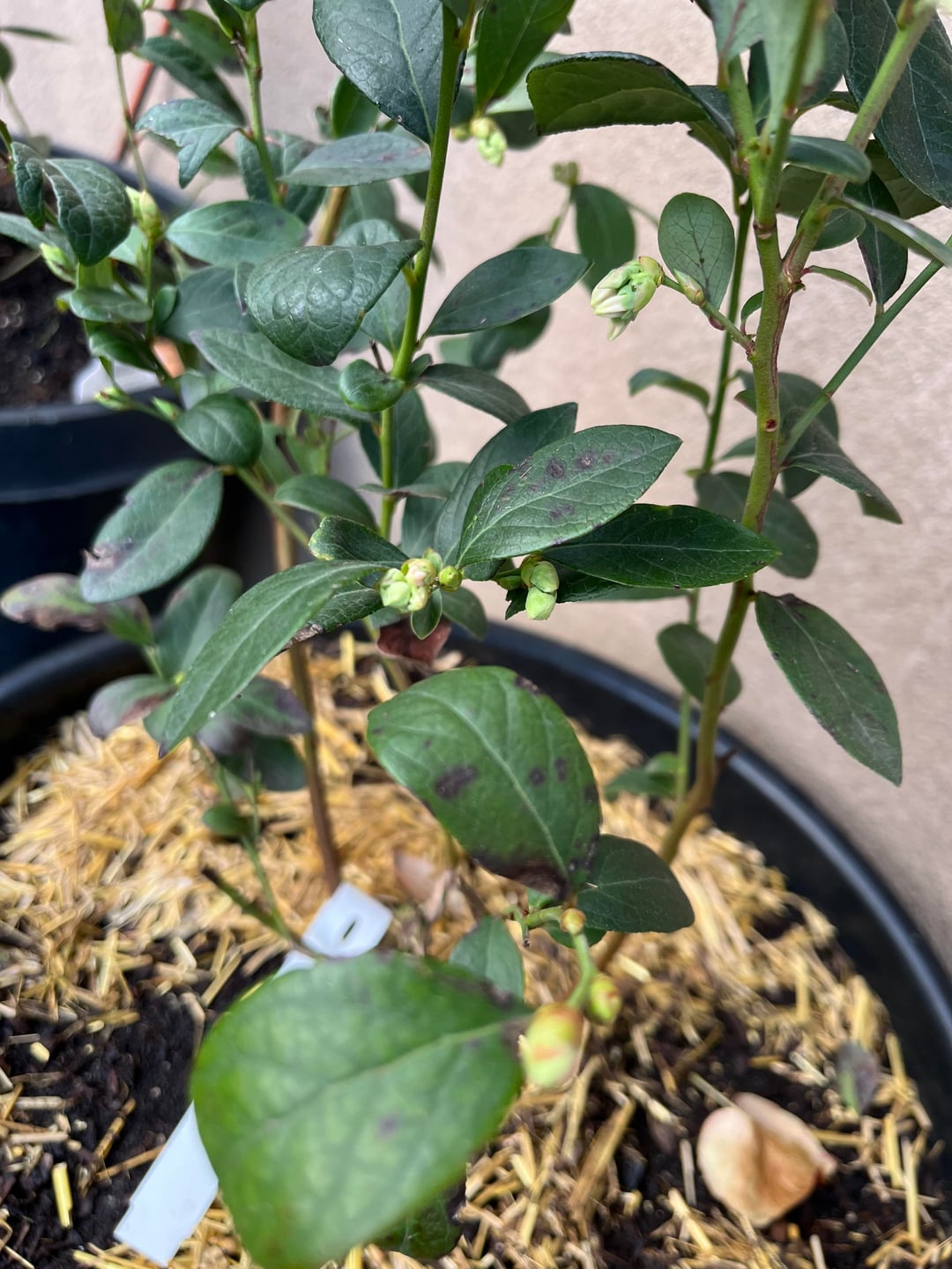ブルーベリーの植物にあるこれらの斑点を特定し、それらをどのように処理するかを知るには、いくつかの助けが必要です。斑点は最近出現しました、沿岸社会ゾーン 10b