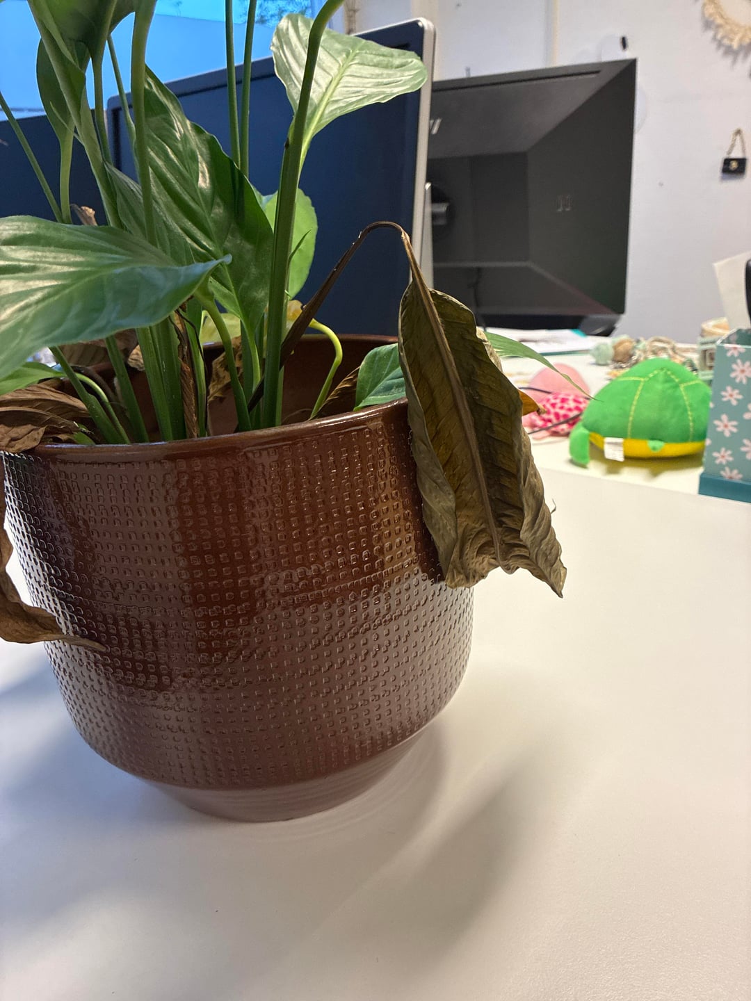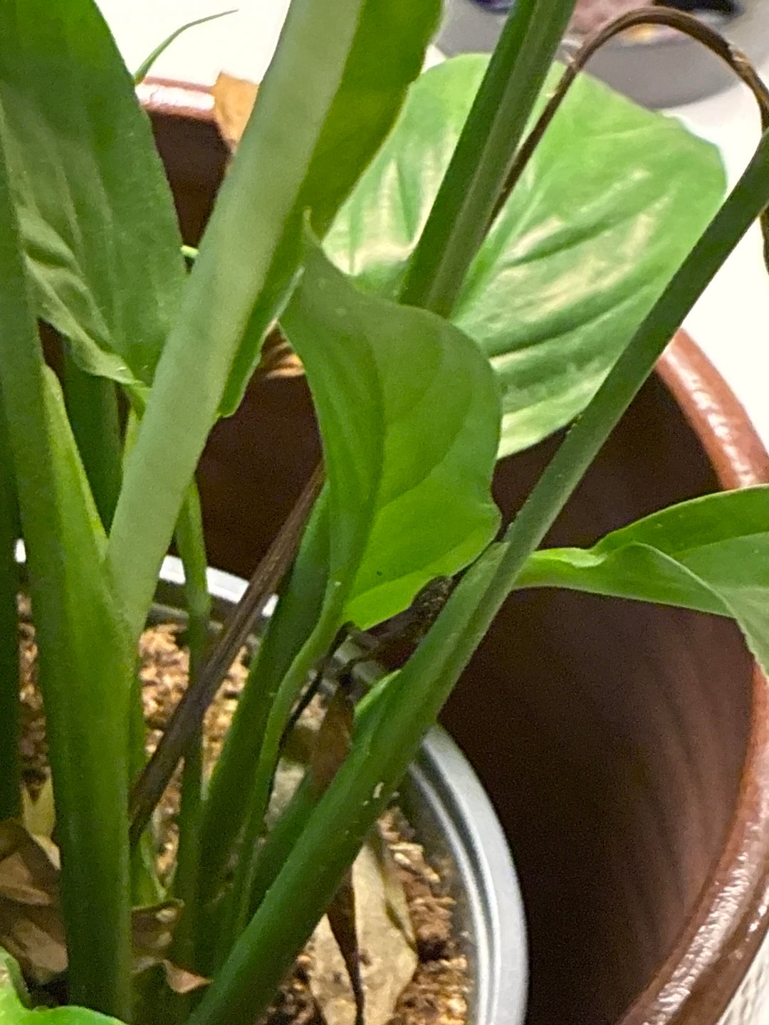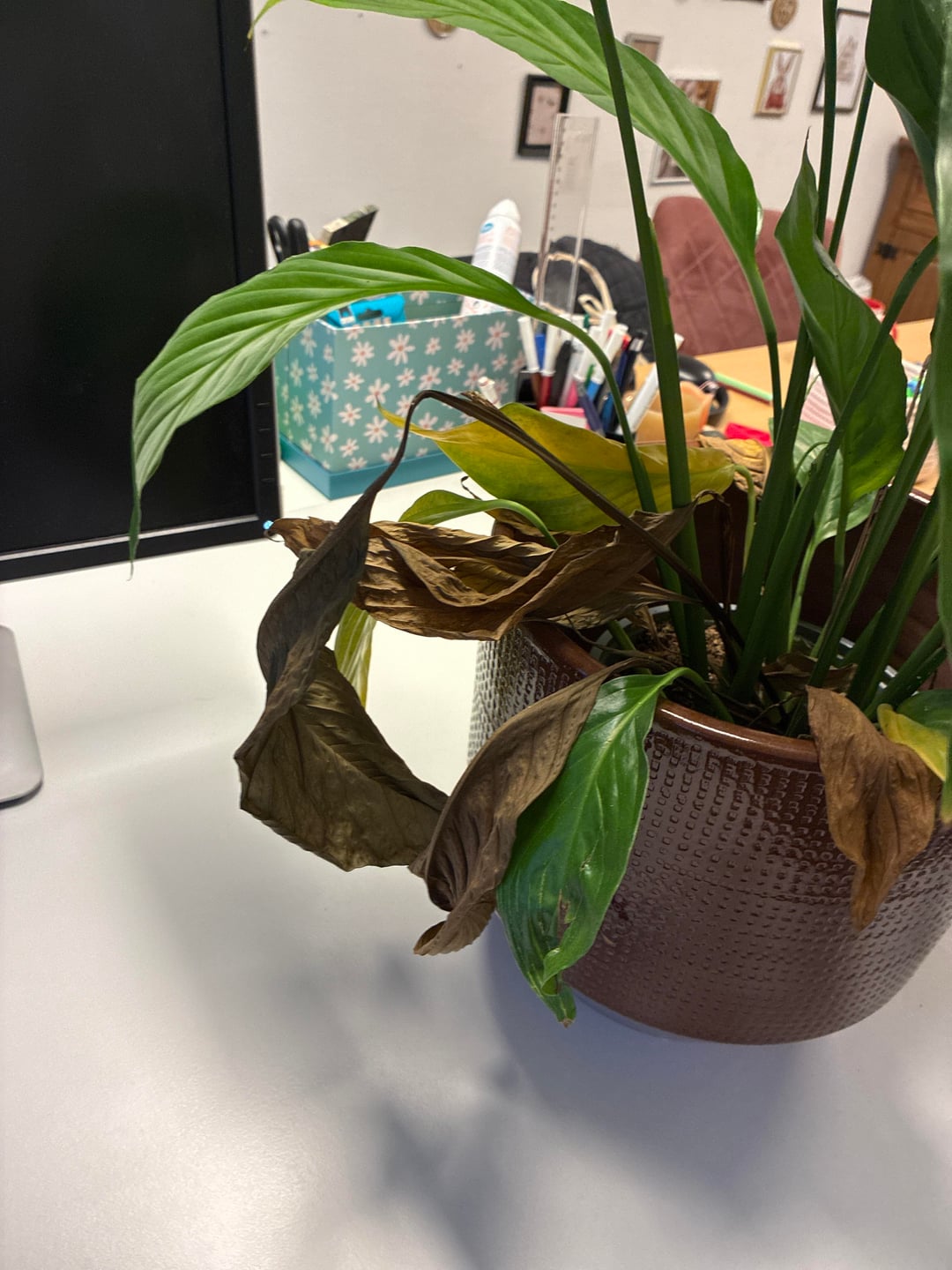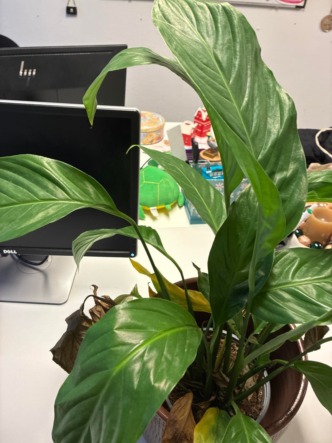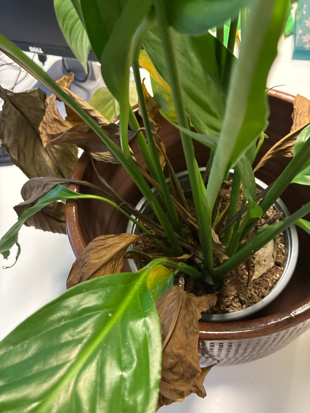 それで、文脈のために、私のカウンセラーはこの平和のユリを持っています、そして、その葉は茶色になり、垂れ下がっています、彼女はおそらくそれに水をやりすぎたことを知っています、しかし私はまた、土壌の中にいくつかの奇妙で憂慮すべきものを見ています。おそらく植え替えて、もっと光を当てるべきだとは思いますが、他に何をすべきでしょうか?