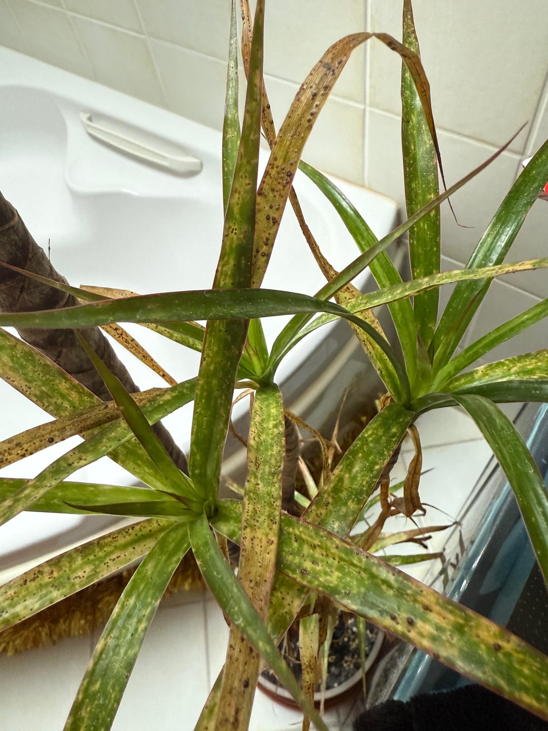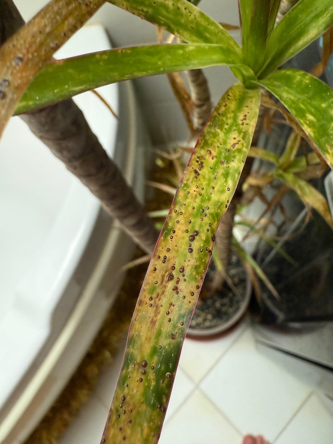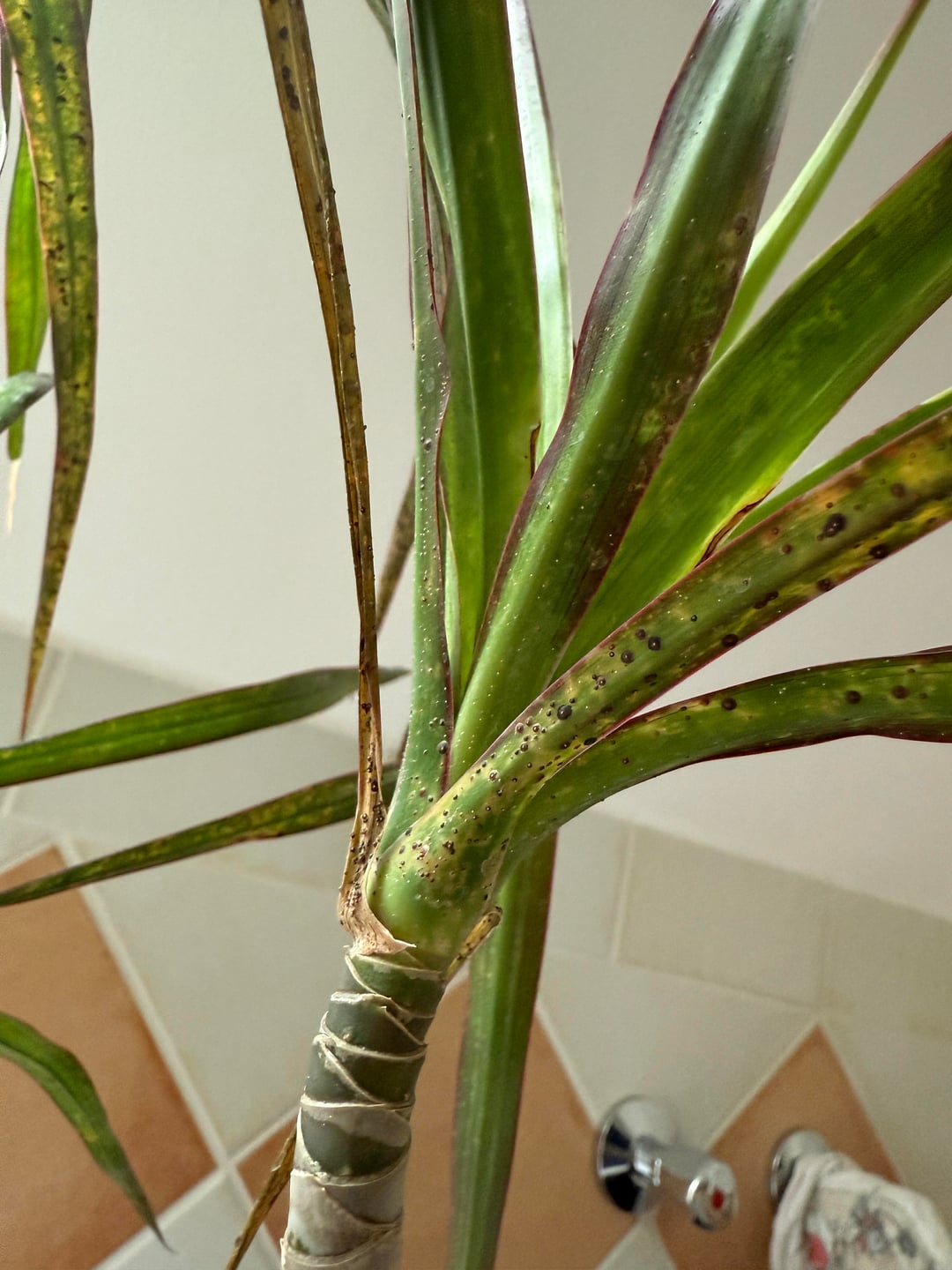 数か月前、セールで大きなドラセナ マルジナータを購入しました。下地が悪かったことと水の量が少ないことを除けば、見た目は良好でした。家に持ち帰ると、通常の日光が入る素敵な植え替えられたバスルームの場所になりました。すぐにこれらの奇妙な点々に気づきましたが、新鮮な葉は常に健康で丈夫でした。頻繁にチェックしましたが、植物の上を何かが這っているのを見たことはありません。肥料が多すぎて栄養が燃え尽きたように見える点だけです。
