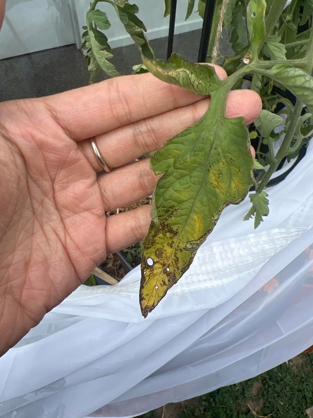 こんにちは、皆さん、トマトの初心者です。最近、私のトマトの葉が少し悲しくて変わっていることに気付きました。写真では茶色がかった斑点か斑点があるように見えますが、葉の1枚に白っぽいものがあり、それは何だと思いますか。不健康に見えるすべての葉を剪定して取り除くことにしました。何が起こっているのか誰か教えてください。 ありがとううううう!