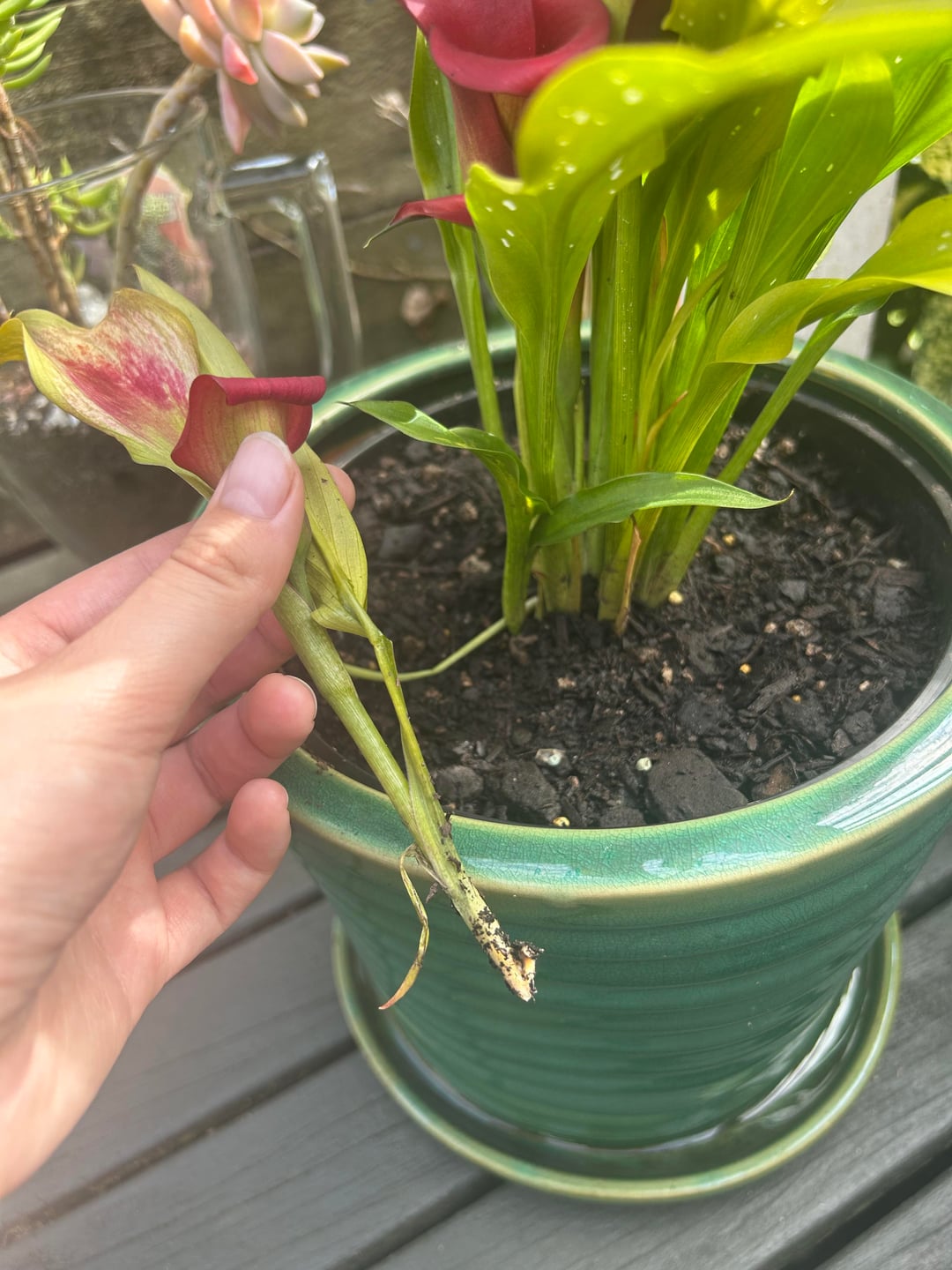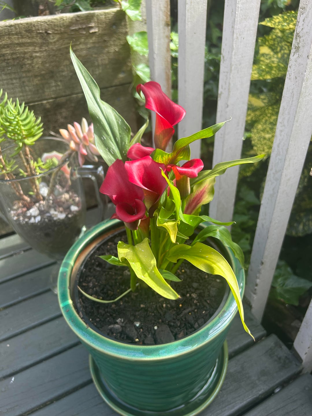 最初の画像は5日前のもので、植え替えたばかりです。次の2枚の写真は今日撮ったものですが、葉はさらに黄色くなり、植物は垂れ下がってバラバラになっています。毎日水やりをしているのですが、一日中直射日光がたっぷり当たります。何が間違っているのでしょうか?