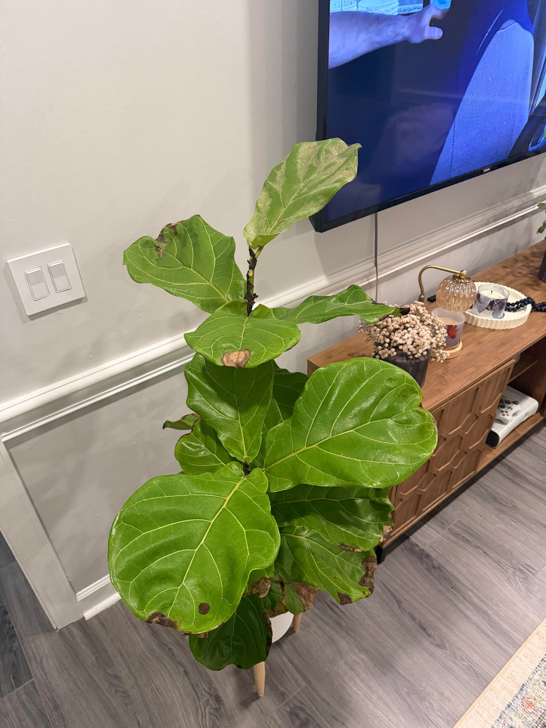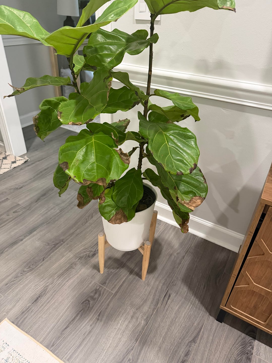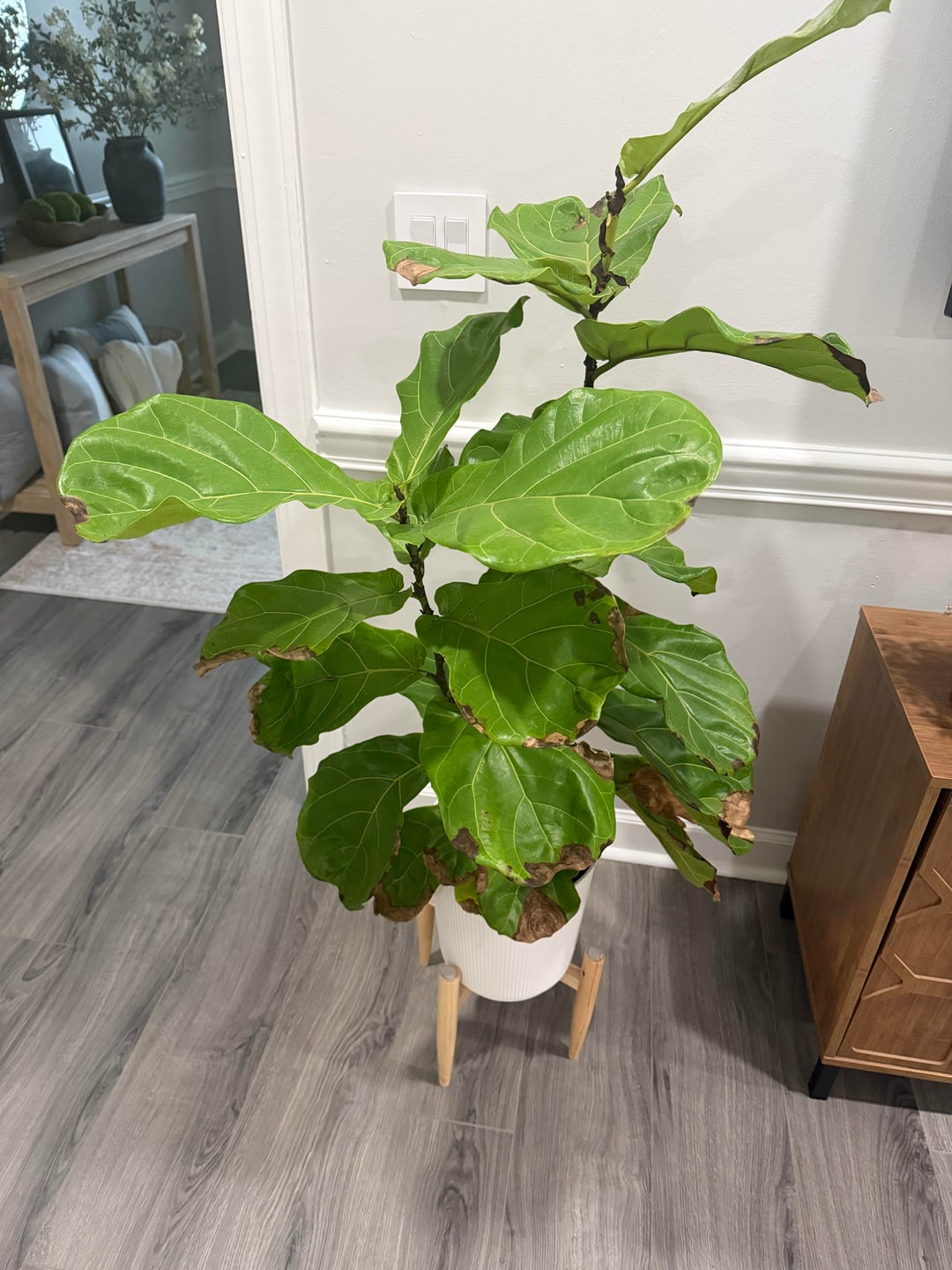 こんにちは、私はこの夏の初めにクローガーからこのフィドルリーフを入手しました。通常、葉が垂れ始めたときに水を与えます。 1週間に1回から10日に1回くらいの頻度でした。
