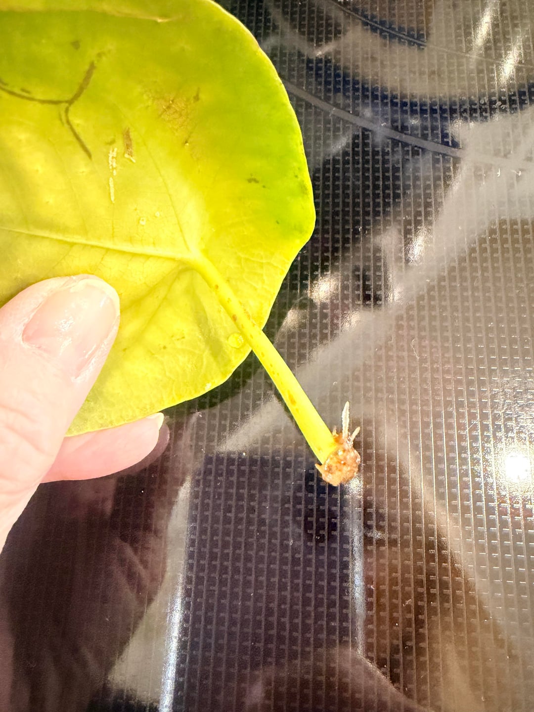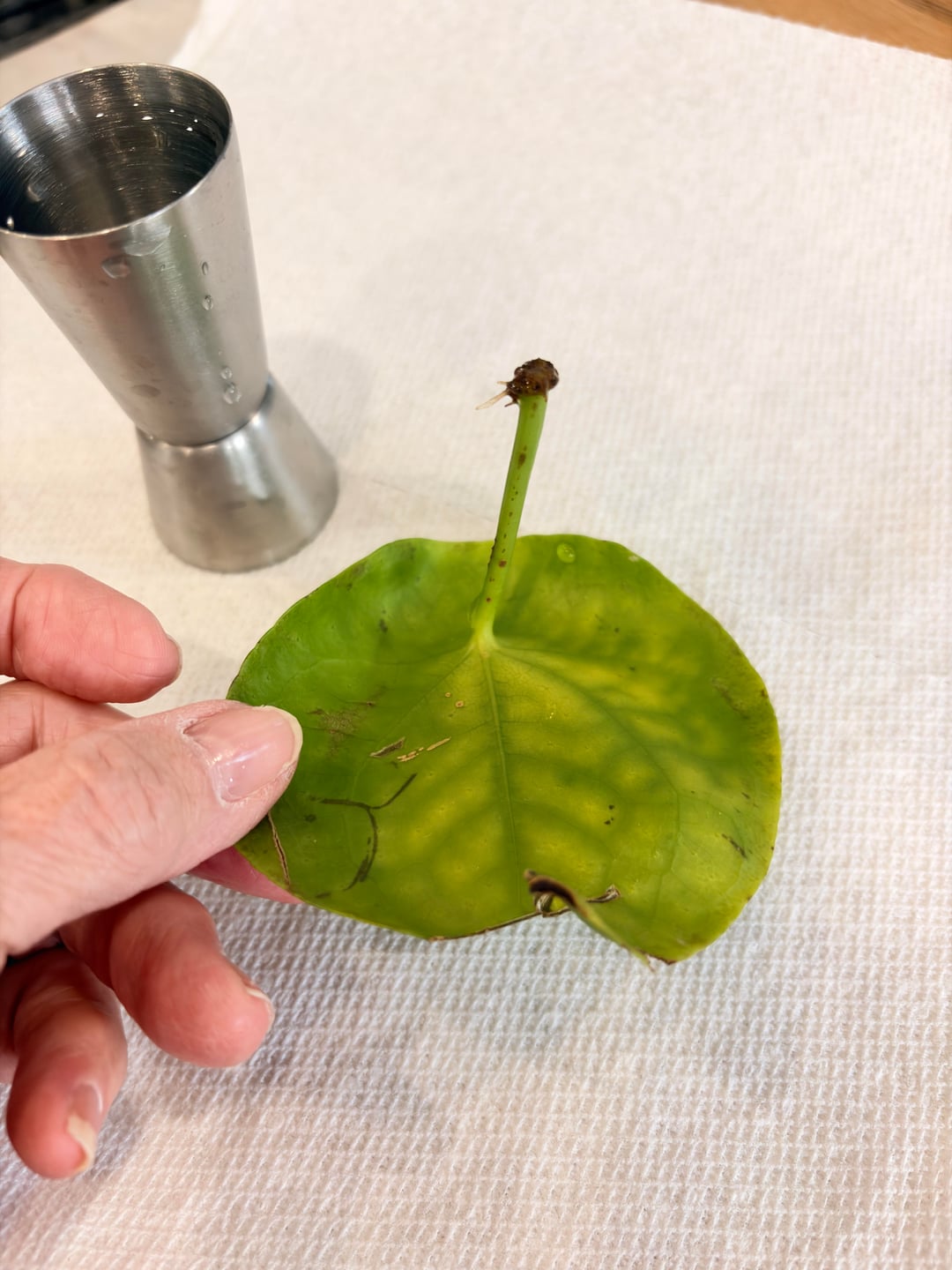 なんと、この大きな大きな葉が数か月前に私のピレアから剥がれてきました。ルーティングできることはわかっているので、水で満たされたショックグラスに入れて毎週水を交換しました。数か月後、ついに赤ちゃんの根が現れました!!うふふ。