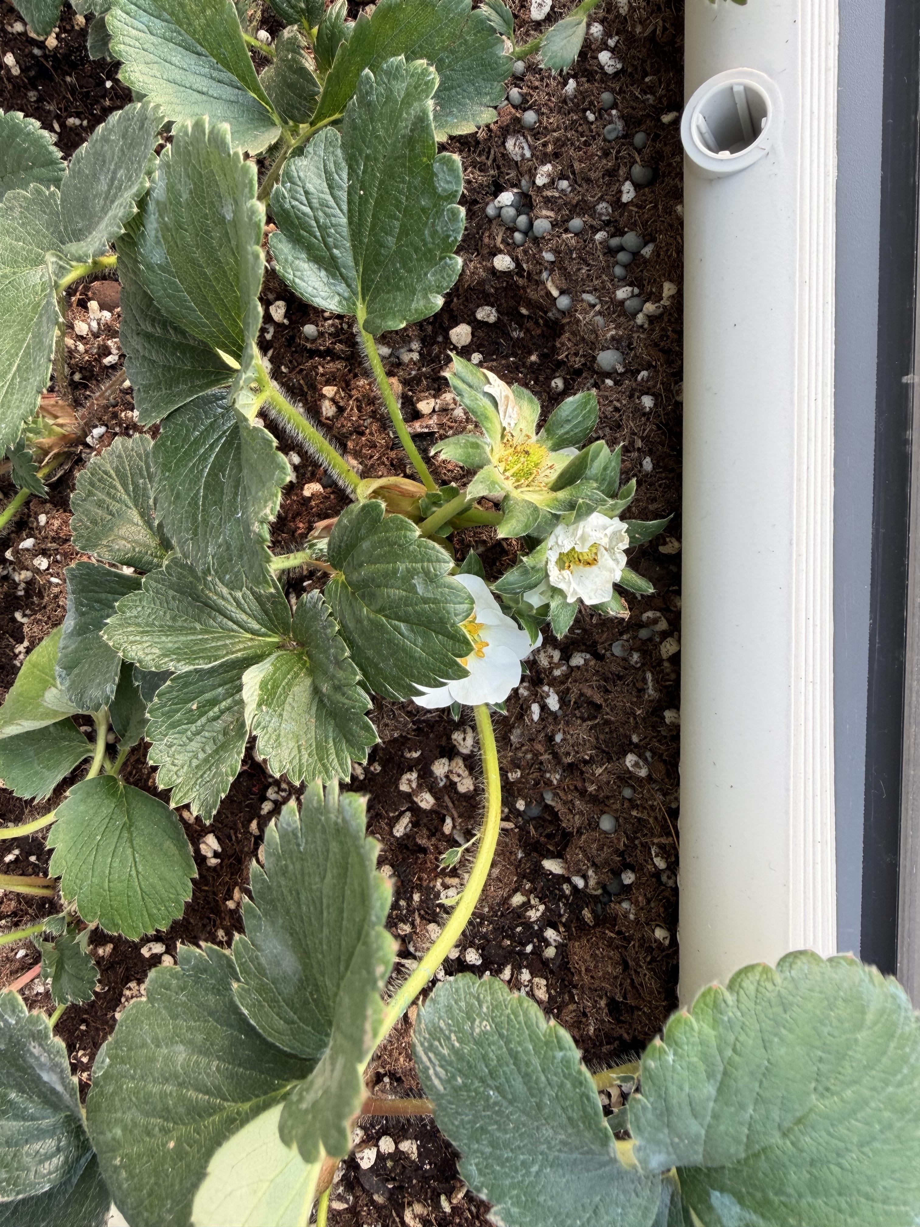イチゴの苗をバルコニーに移植しましたが、元気に育っています。一部は開花し始めています。