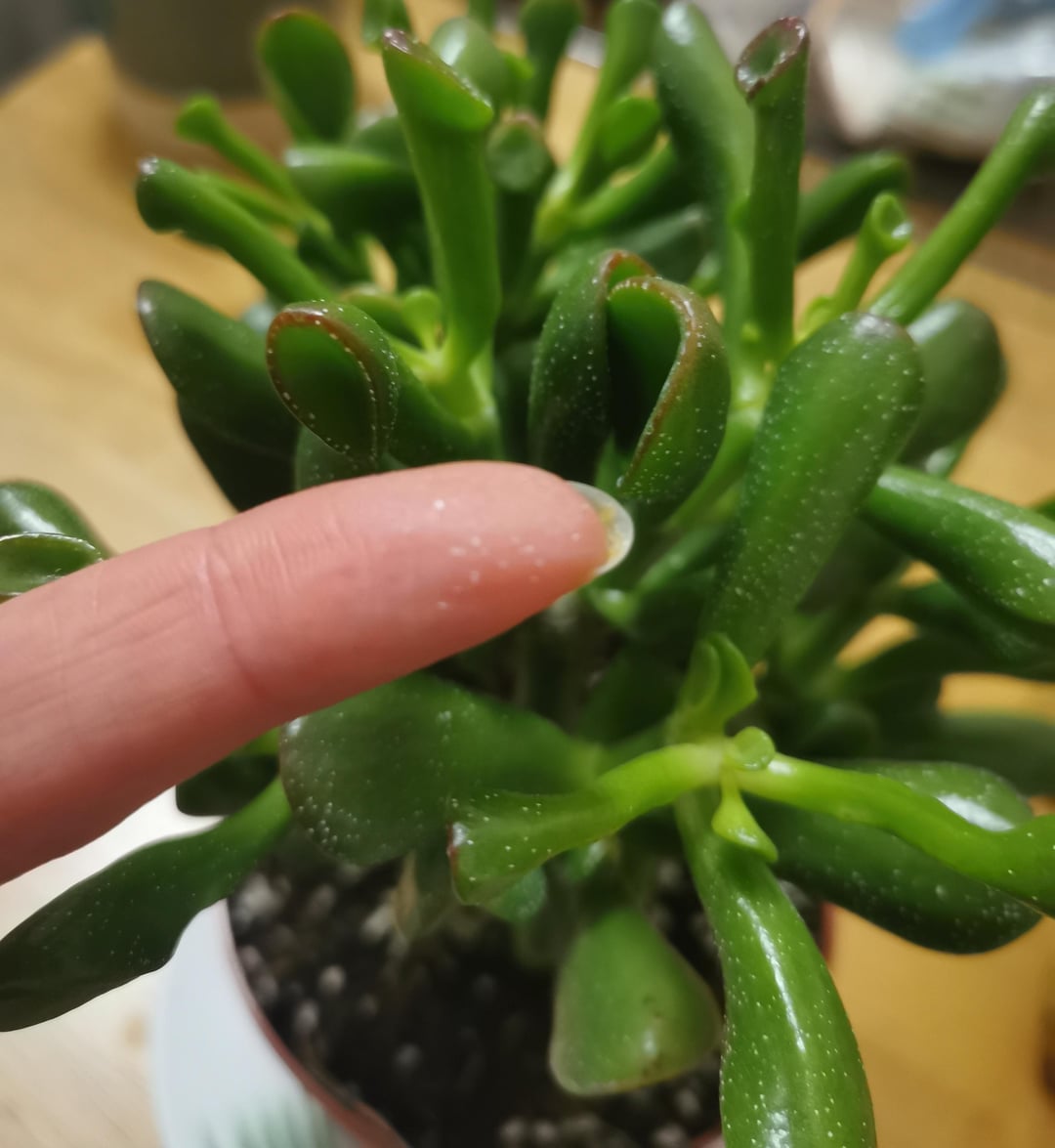 植物に白い粉を発見。指に拭き取ると、埃とは思えないほど濃厚に見えます。それは植物による何らかの分泌物でしょうか、それとも非常に小さな害虫でしょうか?
