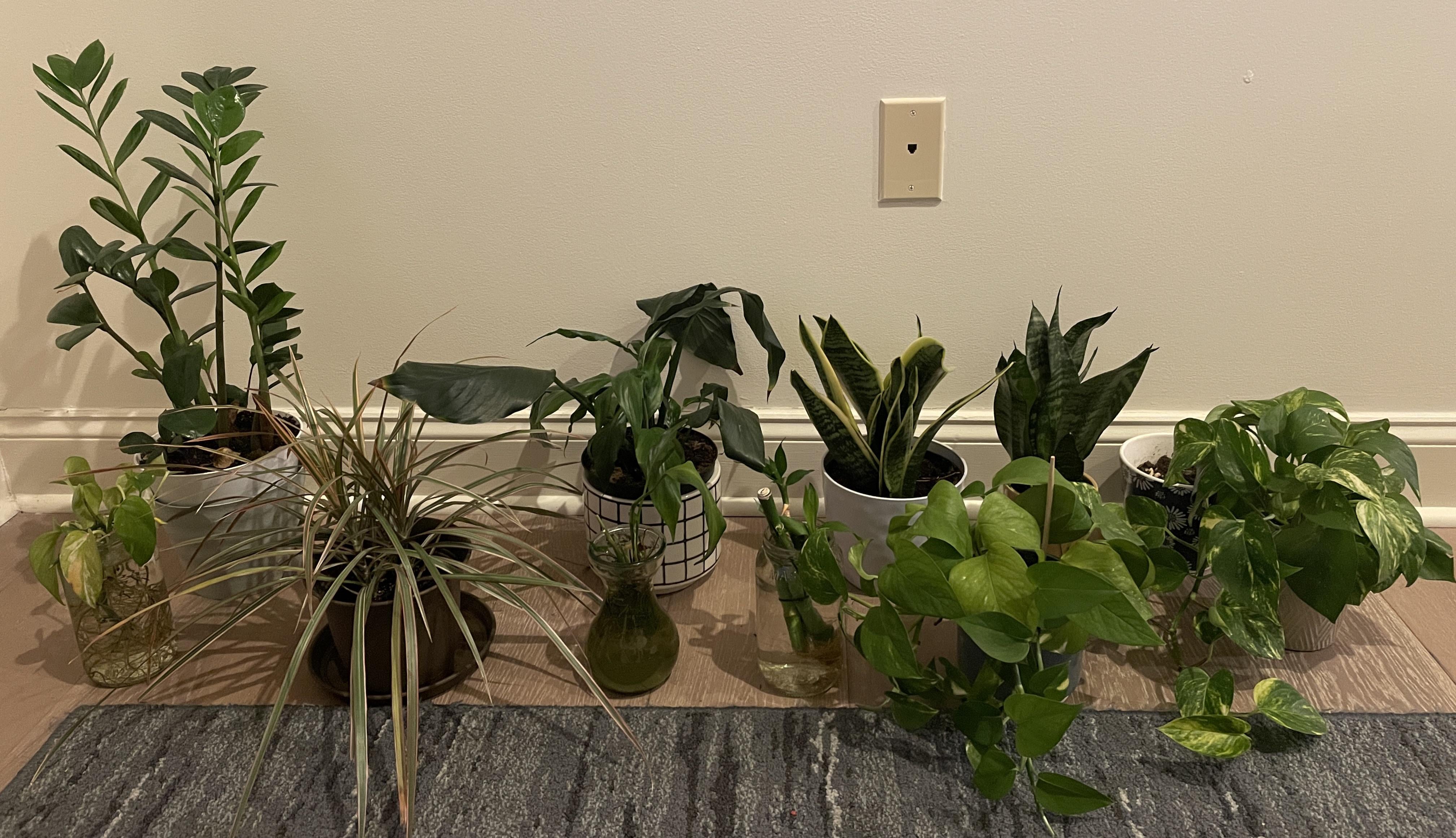 私はこれらの植物を1〜3年間飼っています。これらは、1 zz、1 クモ、2 ピースユリ (1 つは鉢に 1 つは瓶に)、2 つのヘビ植物、3 ポトス、1 竹です。 3週間の休暇を取る予定です。今回は長い休暇なので、休暇中や一般的に植物の世話をどうするか考えていました。ありがとう!!