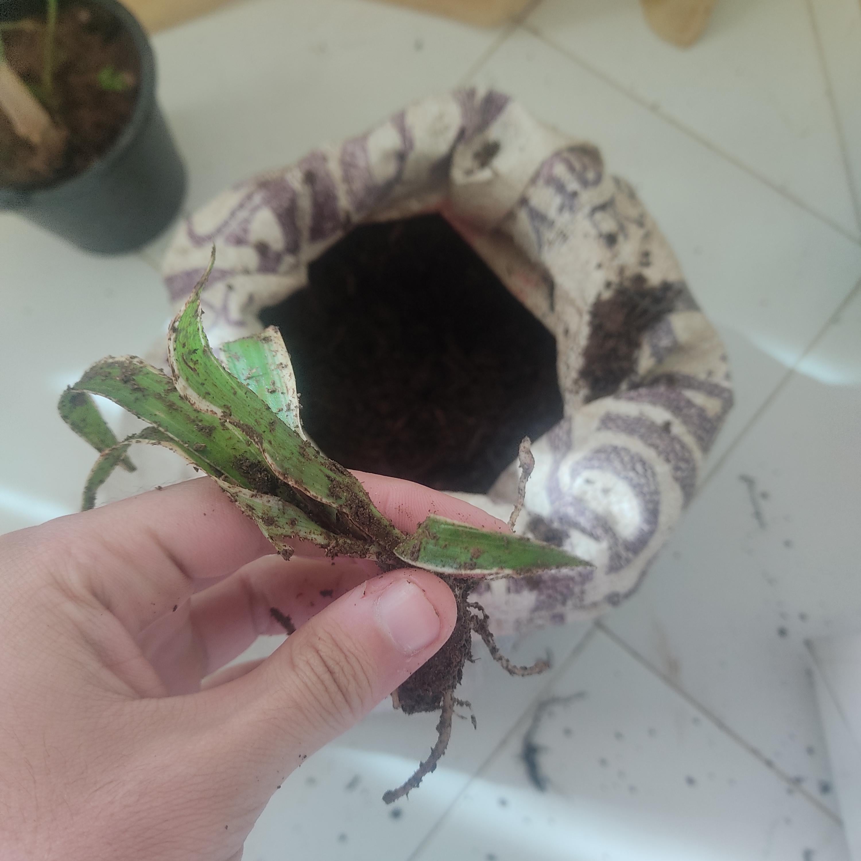 このクモの植物に触れるまで、私は土の入った袋から手を使ってポットに水を詰めていました。まだ生きているので専用の鉢をあげました。