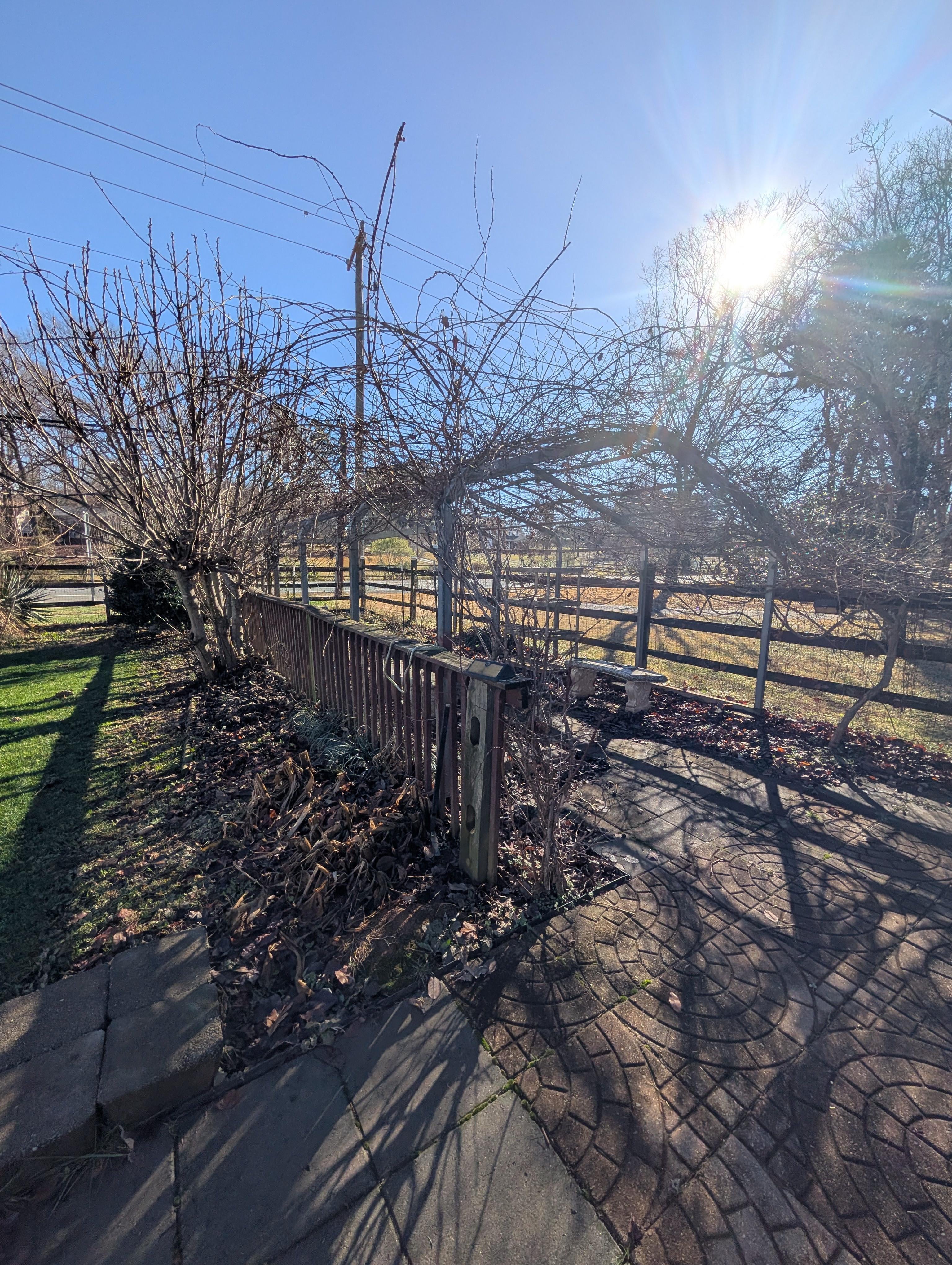 写真 1 には 3 つの主要な蔓のうちの 1 つがあり、その上に絡み合った蔓の鳥の巣が示されています。写真2は残りの2本の蔓です。少なくともそのうちの1頭は東屋から離れてフェンスラインを下っていきます。