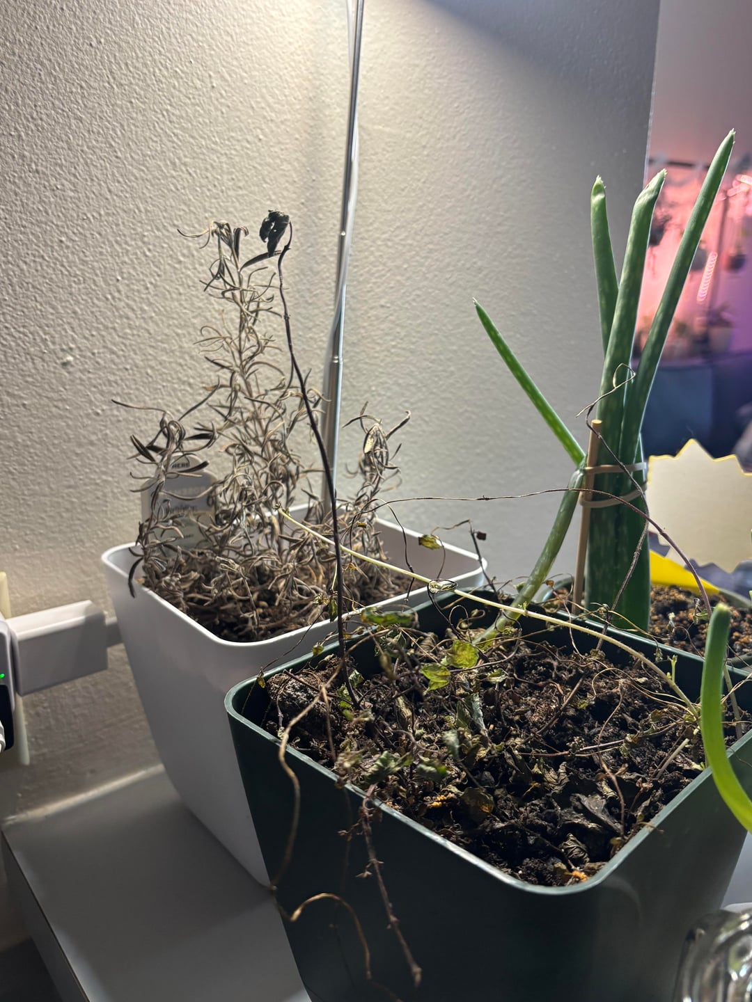 私は他人事のようにパトスやクモの植物を育てることができます。しかし、食品に関連する植物は必ず枯れます。 ローズマリーとミントの植物を救うのを手伝ってください!彼らは育成ライトの下にいて、私のシンクの隣に座っています ミントの写真は最悪だが、葉のついた短い枝がたくさんあり、長い茎は枯れかけている
