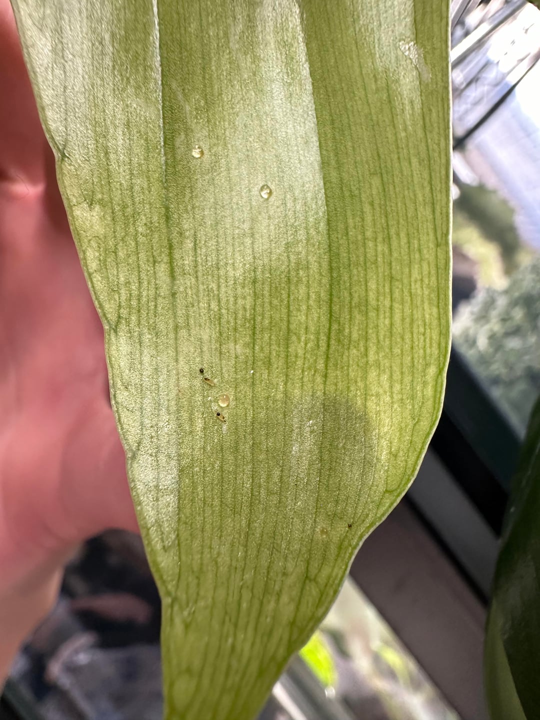 私は以前、この樹液のような透明なものについて投稿したことがありますが、パニックになって彼女にシャワーを与え、水カスティール石鹸と70%イソプロピルアルコールをスプレーしましたが、誰もがこれらの植物ではそれが正常であると言っていました。でもこの黒い斑点は?私には幼虫のように見える人もいますが?私はただ狂っているだけですか?