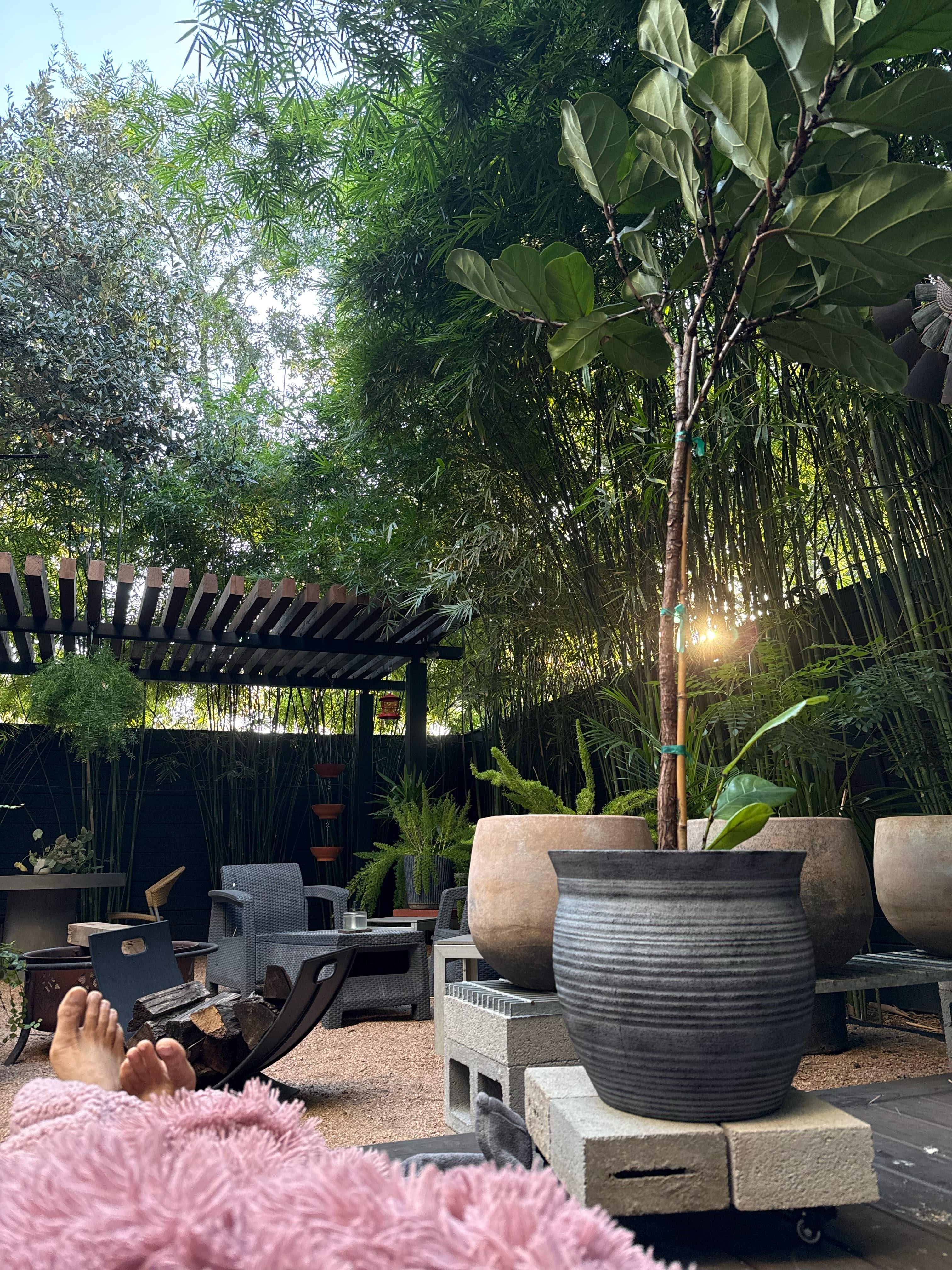 午前8時31分、肌寒い土曜の朝、気温約59度、太陽がちょうど竹の間から差し込み始めています…素晴らしい一日になりそうです! ☮️