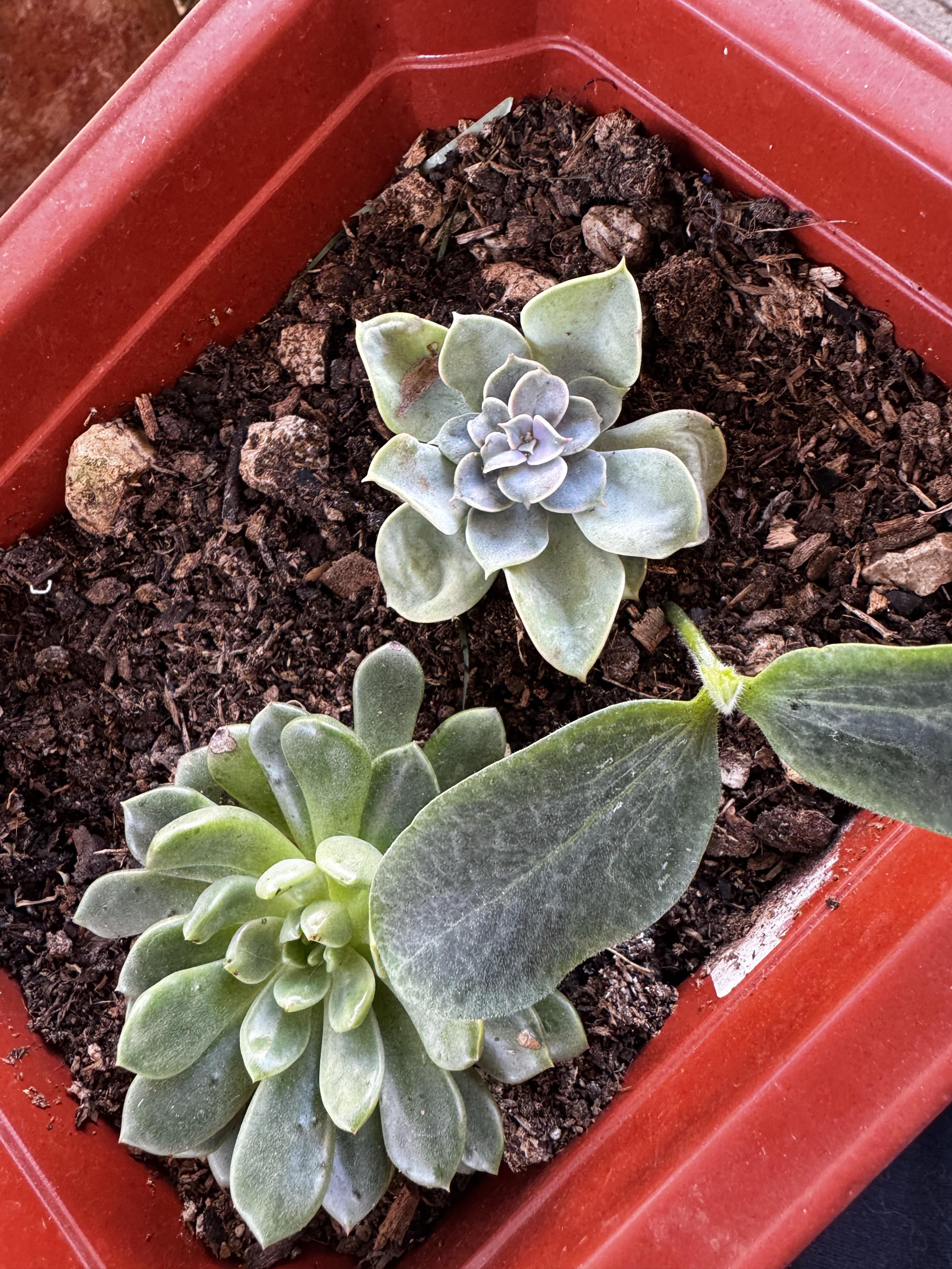 こんにちは!この2つの多肉植物を約3か月間飼っています。一年中暖かくて気候の良い場所に住んでいます(🇨🇷)、庭の屋根付きの屋外に置いています。この植物は3日前にどこからともなく現れました。家族は、私が購入した基材に入っていた別の種類の多肉植物ではないかと言います。質感は多肉植物と同じですが、これまでに似たものを見たことはありません。この小さな男が何であるか考えられますか?