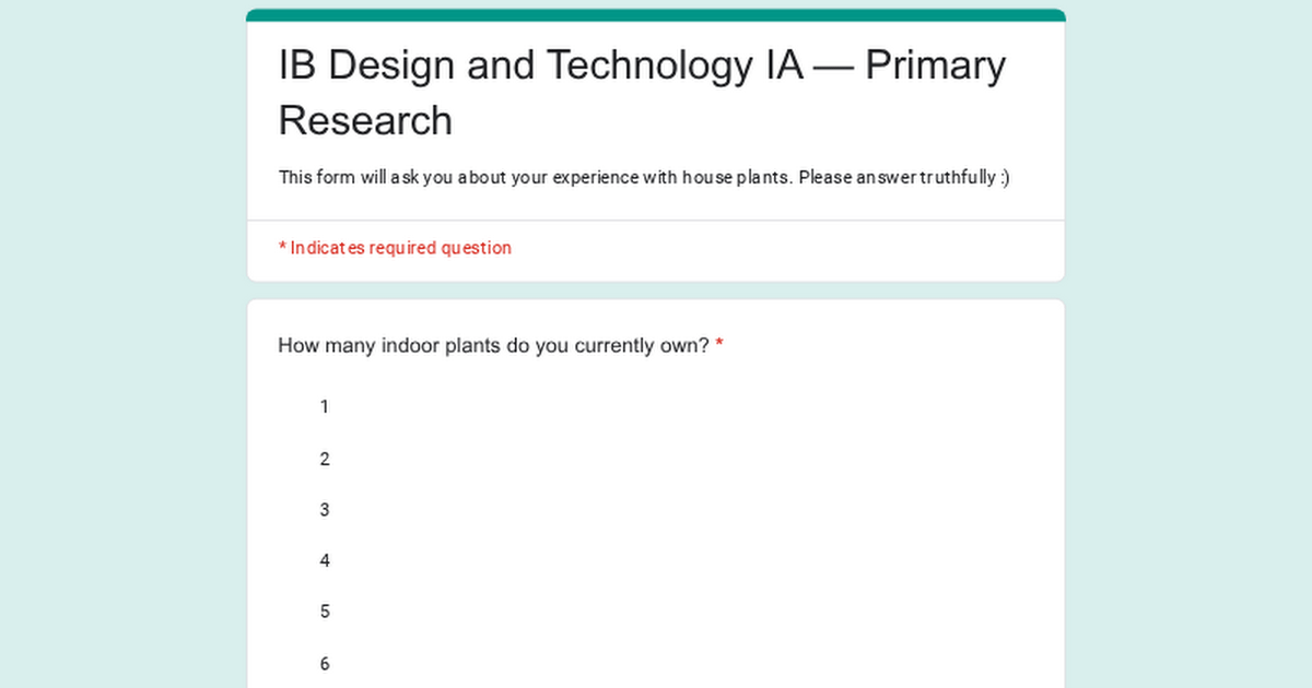やあみんな!私は IB デザインおよびテクノロジー プログラムの学生で、現在内部評価プロジェクトのためのデータを収集しています。私は特に観葉植物と人々がそれらをどのように世話するかについてもっと学ぶことに興味があります。 Google フォームで簡単なアンケートに答えていただければ、ご協力いただけると思います。あなたの反応は私にとってとても意味のあるものになります! https://forms.gle/5KMSixs2ESb5HVqj7