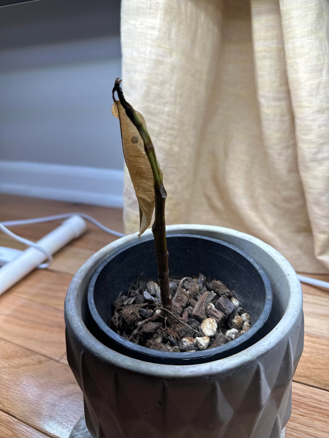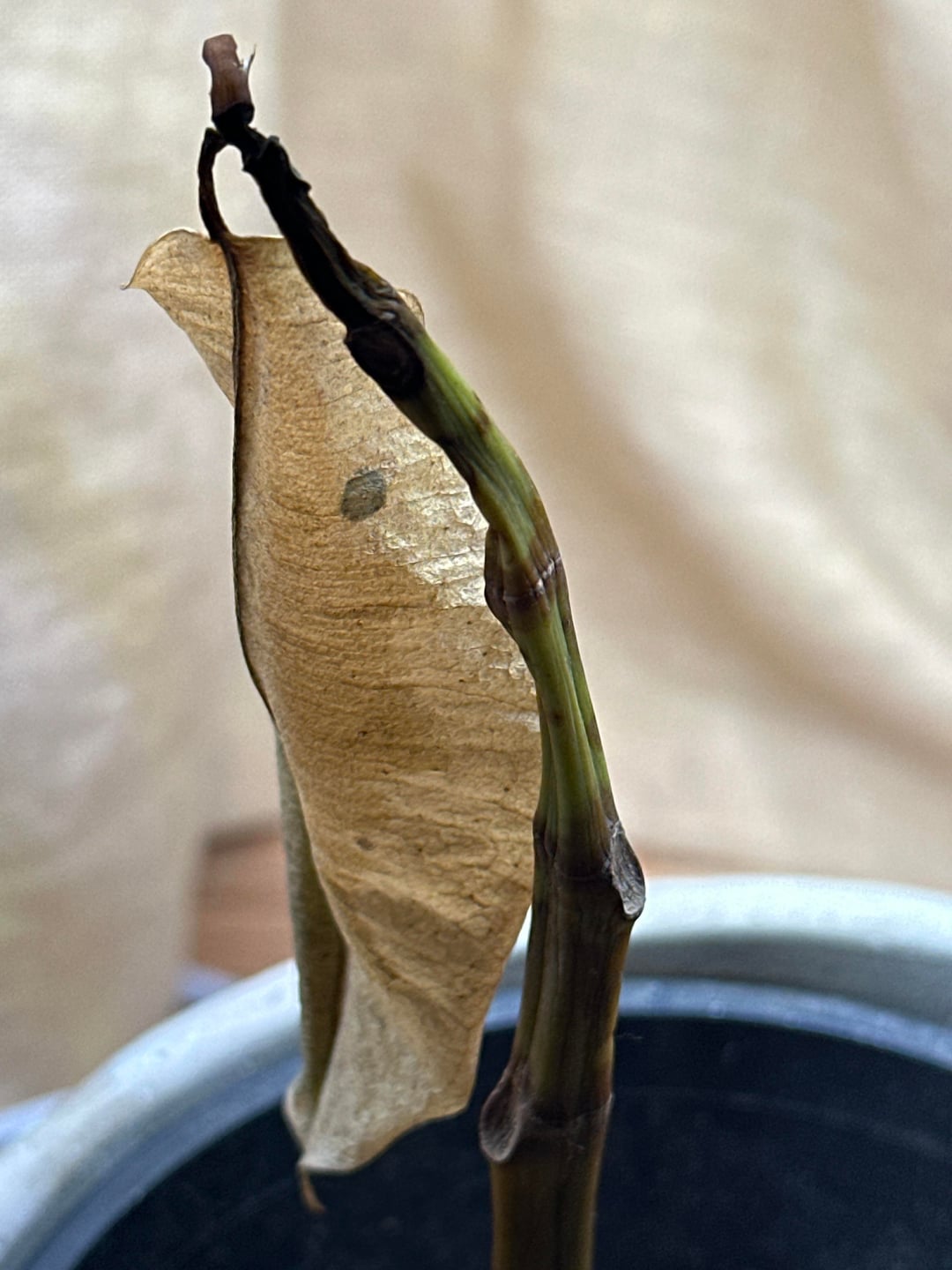 現在のゴム工場の写真。数か月前は比較的健全な状態で、3~4枚の健全な葉がついていました。去年の冬に室内に取り込んだ時も葉を落として枯れそうな感じだったのですが、今年の夏には新しい葉が出てきましたが、この秋に友人が数週間見ていた時にも水のやり過ぎだったのかもしれません。それを捨てる希望や時間はありますか?