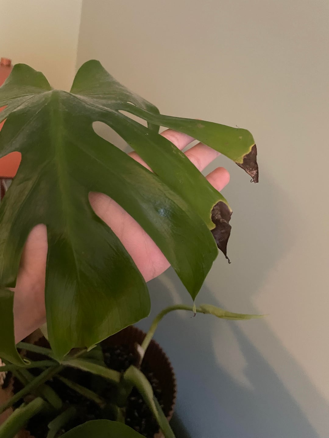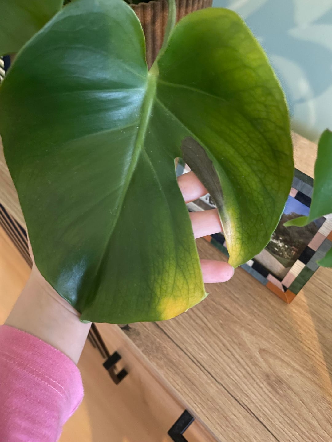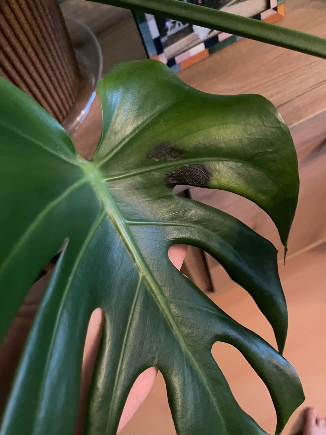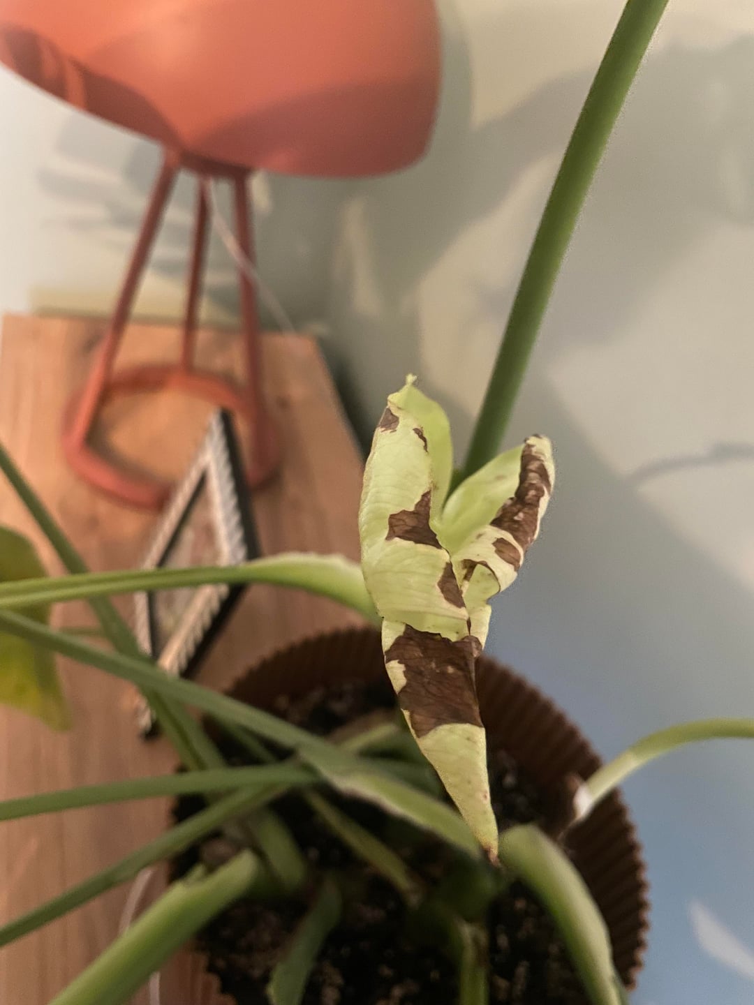 しばらく前にデパートでこの植物を購入しました。最初は順調に成長していました。土、パーライト、ココナッツチップ、膨張粘土(LECA/ケラムザイト)、砂を混ぜたものに植え替えました。鉢には排水穴があり、植物は南向きの窓から約2メートルのところに置かれています。夏にかけて、根腐れの兆候が見られ始めました。土を新しい混合物と交換し、どろどろになった根を切り取り、残った根を希過酸化水素で処理しました。その後は回復傾向にあるようでした。しかし、新しい葉には黒い斑点があり、展開するのに非常に時間がかかります。古い葉の一部は黄色くなり、斑点が発生し始めています。これの原因は何でしょうか? 次に何を試すべきでしょうか?