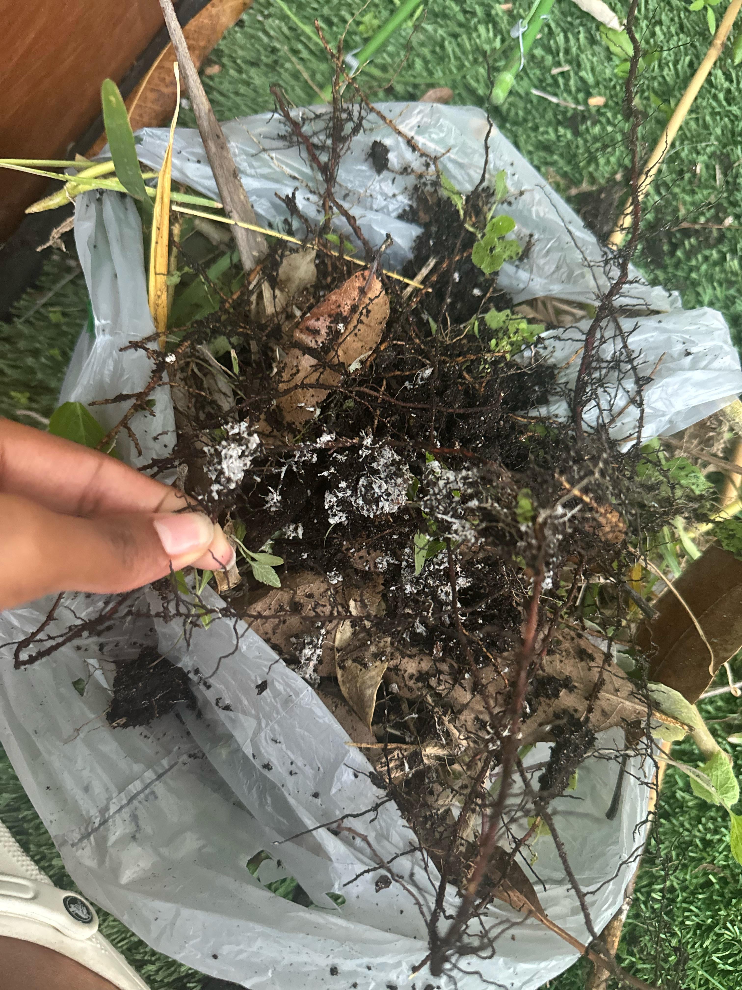 庭の花壇を調べて植物を抜き、それを片付けようとしています。これが何であるかわからないことに遭遇しました。もしかしたら霜かカビでしょうか?誰か教えてくれませんか?灰色がかった白いもののことを話します。