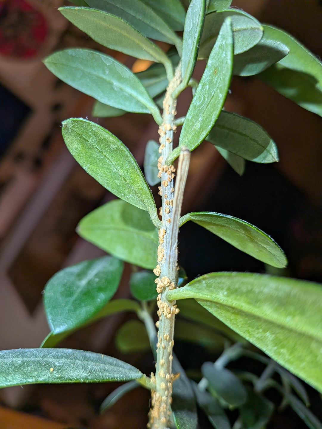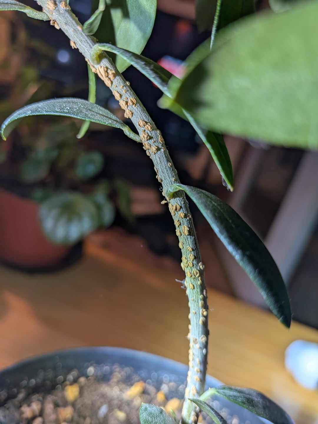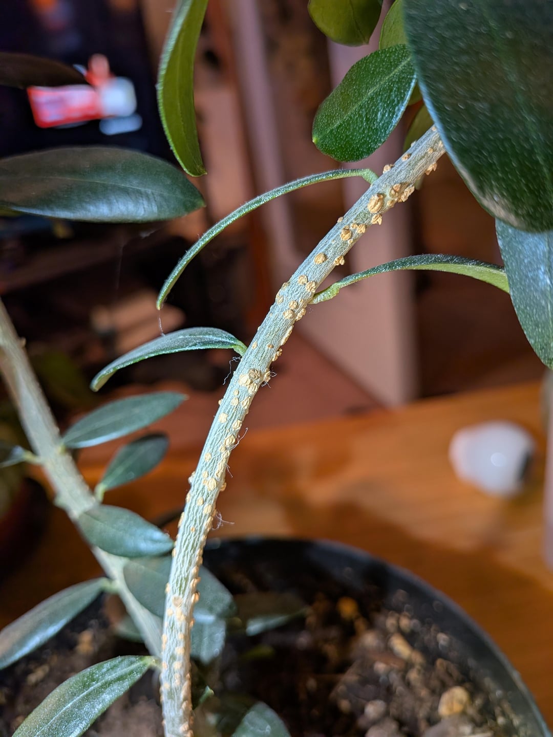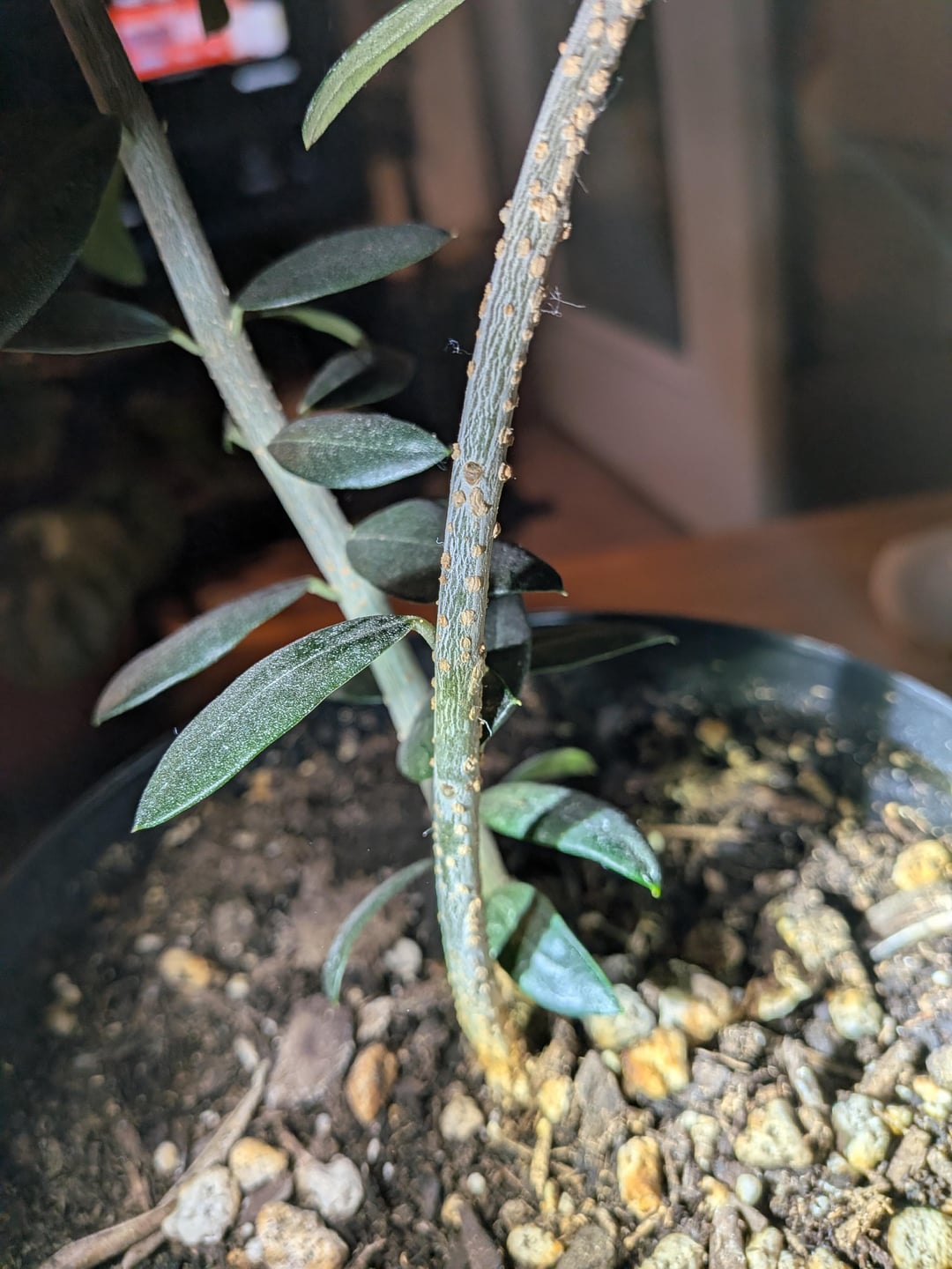 これらは鱗のようには見えません。昆虫ではありません。それらは乾燥していて、剥がそうとすると崩れてしまいます。でこぼこは茎にのみあり、葉にはありません。それ以外の点では、植物は非常に健康であるように見えます。何かアイデアはありますか?おそらく何かの菌類でしょうか?