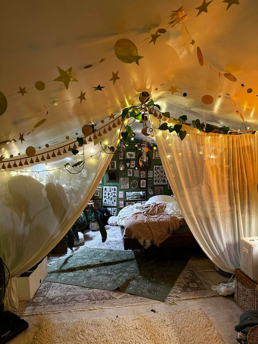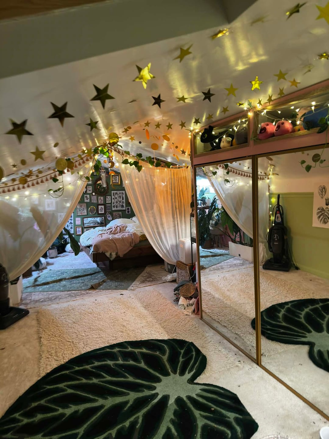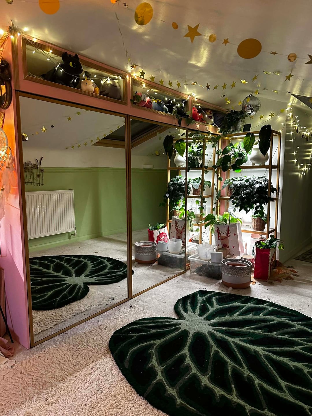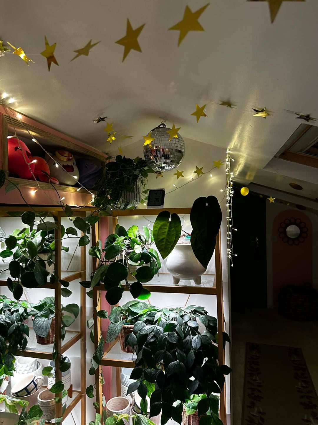 現時点では、これが基本的に私の毎日の部屋です。クリスマスに向けて新しい植物の棚を用意したいと思っているので、現時点では少し作業中です。栽培テントの中に植物を置いていますが、ゴールドのスターガーランドを飾っていて、可愛くて幸せそうだと思っていました。散らかっていても構いません 😂 すべてがきれいになり、棚が入手できたら設置したら更新することを約束します。 誰かが私にもここに投稿するように頼んだのです。