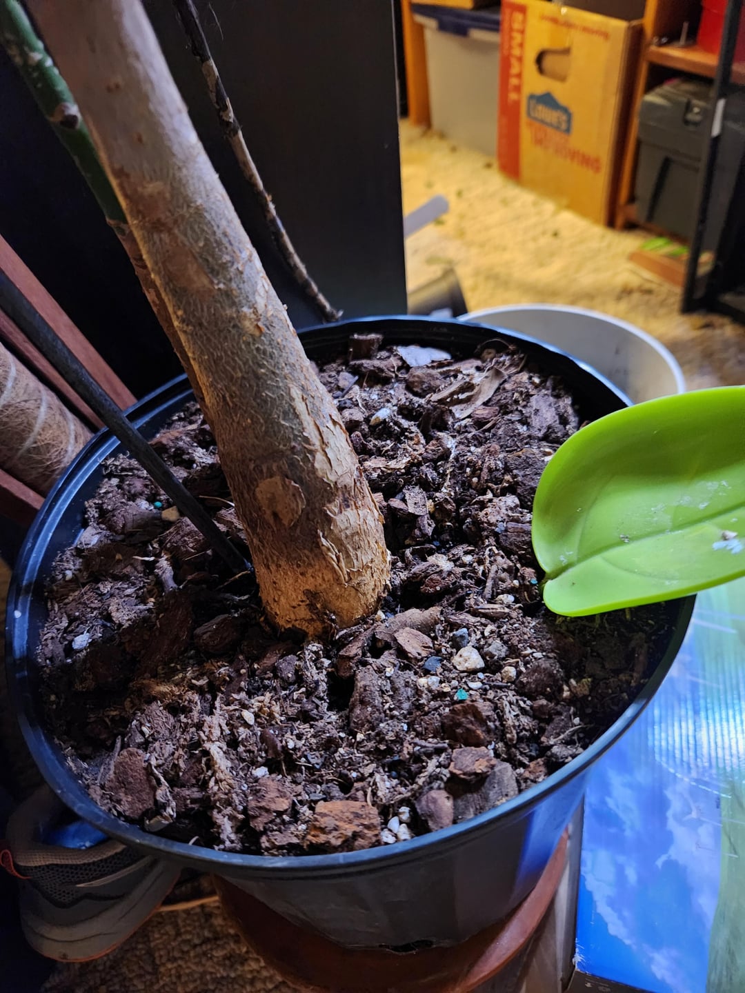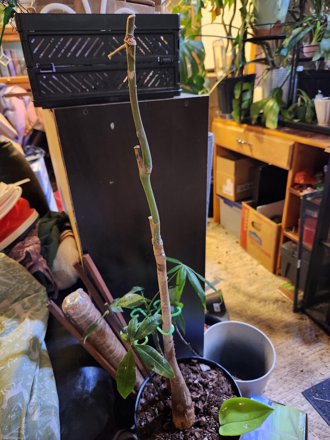この金のなる木は普段はカメレオンの囲いの中に住んでいますが、霧がかかったせいで葉に細菌の斑点ができてしまったので引き抜きました。影響を受けた葉を取り除き、ふにゃふにゃした茎を取り除き(かなり前に編み込まれていなかった)、治療して、小さな仲間と一緒に植え替えました。この大きな茎は、私が元の植物から残したものです。