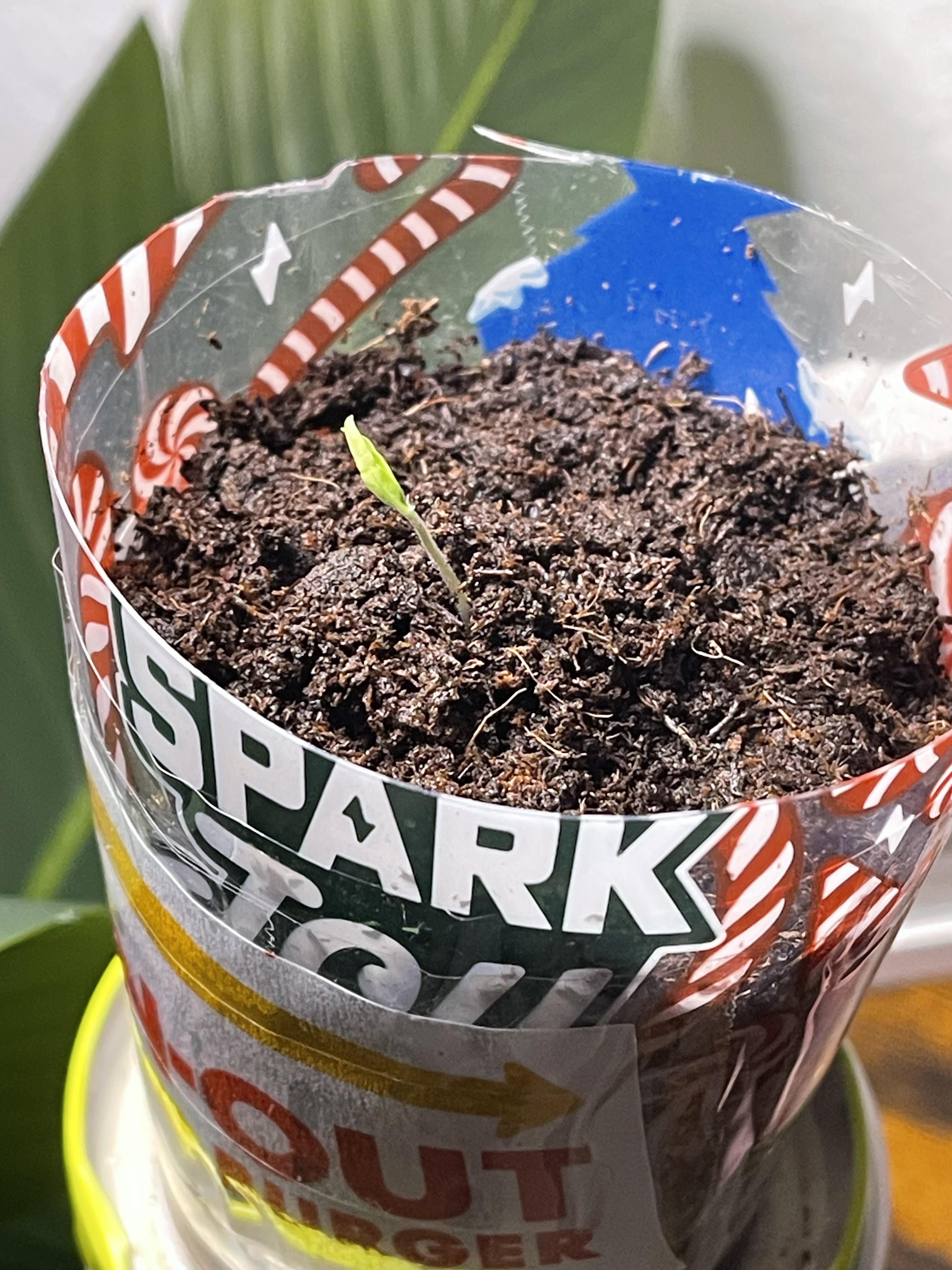 In-N-Out からダブルダブルで届いたトマトのスライスから約 5 つの種をきれいに取り除き、植えた結果です。これは、底に水抜き穴のある半分に切り、湿度を約 5 日間維持するために上に蓋を置いたプラスチックのカップに植えた結果です。蓋を外して育成ライトの下で見ると、その日のうちに約5倍の大きさに成長しました。