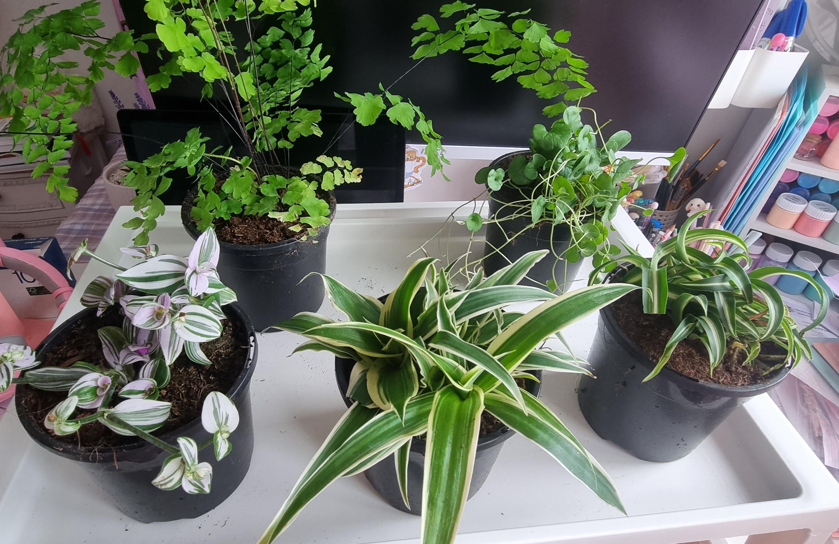 ガーデニングや植物に関してはまったくの初心者なので、アドバイスをお願いします。 棚の奥行きスペースが足りないので、小さめの育苗ポットに植え替える方法はありますか? 現在は全て12cmポットに入っているのですが、10cmに収めようと考えています。 植物は左上から右へ: メイデン ヘア シダ、ディコンドラ エメラルド フォールズ 植物は左下から右へ:ムラサキツユクサ ピンクドラゴン、スパイダー、カーリー スパイダー そして、サイズは小さくても豊かで豊かな状態に保つ方法はあるのでしょうか?