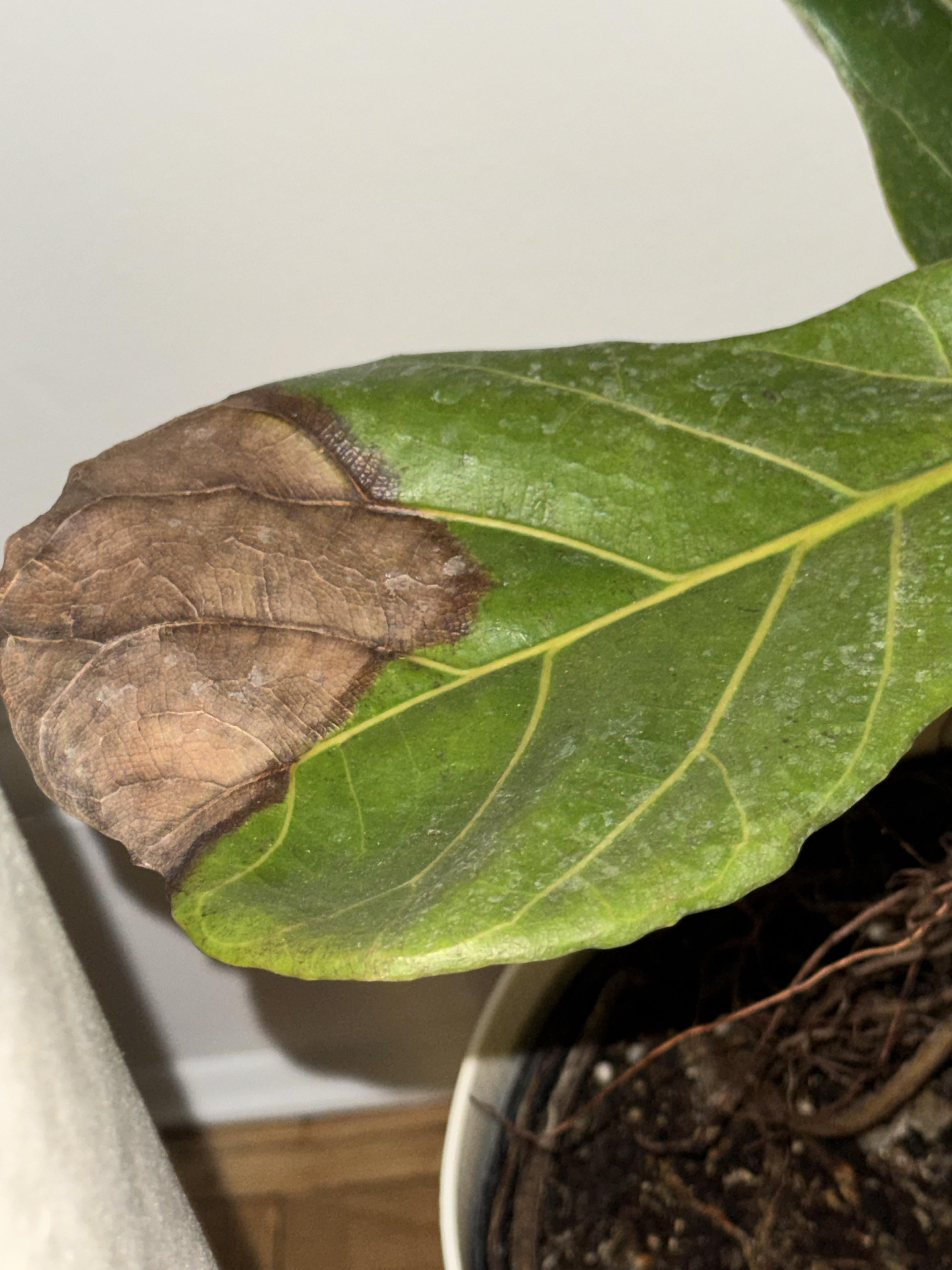 10インチのポットに植えているフィドルリーフの葉に最近茶色の斑点が現れ始めました。これは光が少ないためですか、それとも水が足りないためですか?最近、植物を家の中の光の少ない日陰の場所に移動したので、それが理由ではないかと考えています。表土が乾いたら、7〜8日ごとに約24オンスの水やりをします。