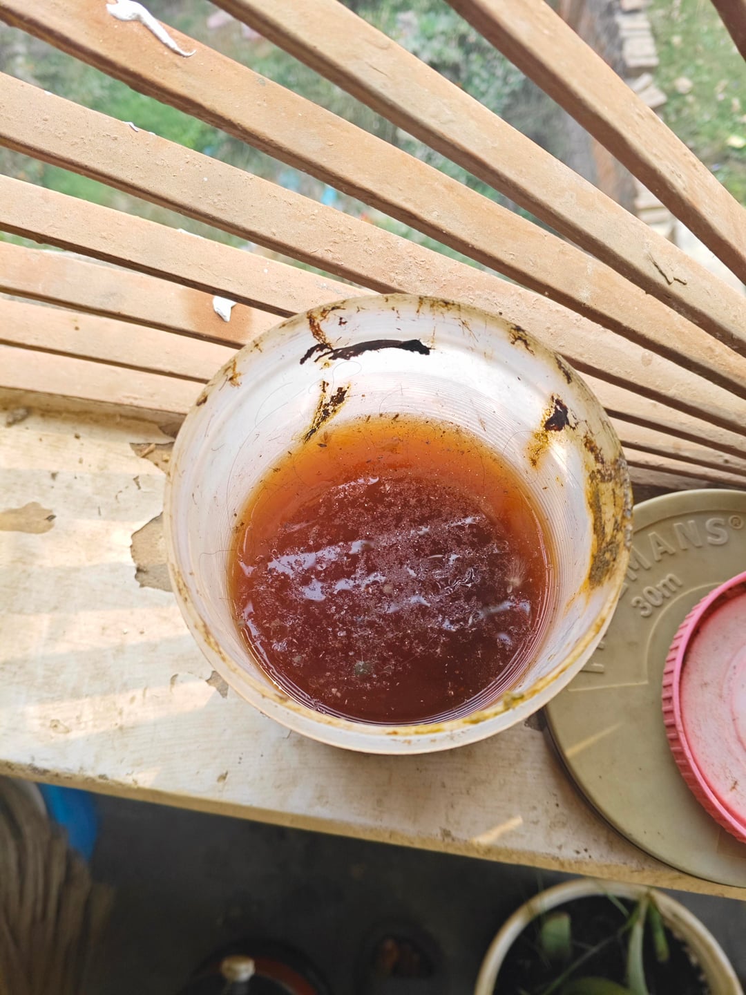 1週間ほど前、誤って500g~1kgの砂糖を床に落としてしまい、捨てずにこの古い液体肥料に加えてしまいました。全くかき混ぜていないんです。容器はキャップに穴の開いたペットボトルなので通気性はありますが密閉性はありません。