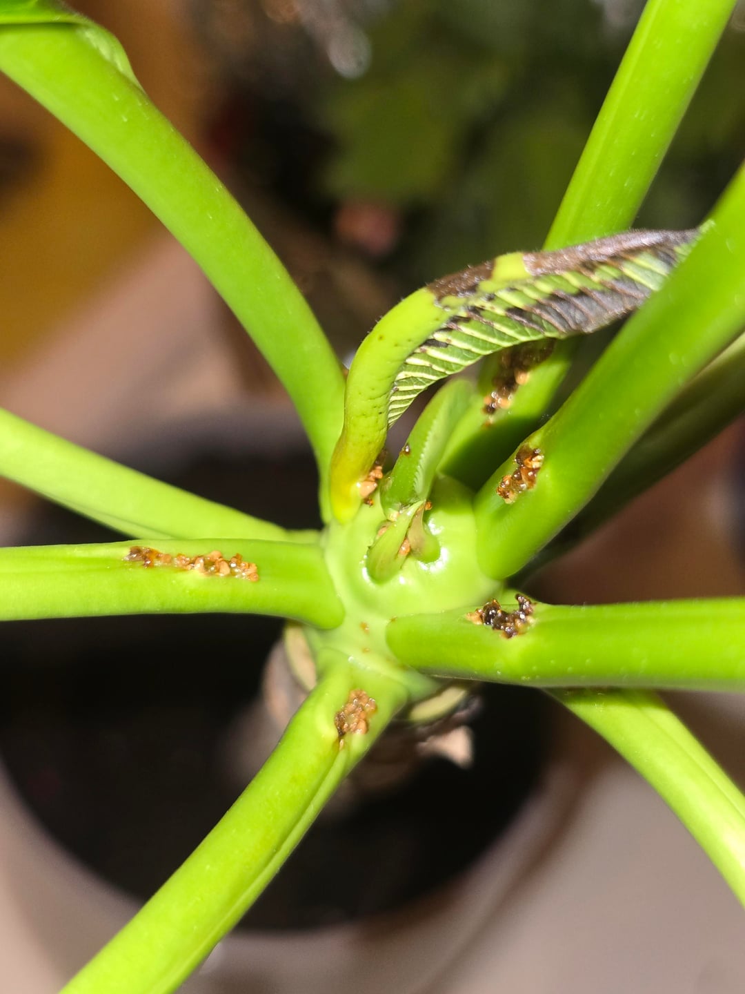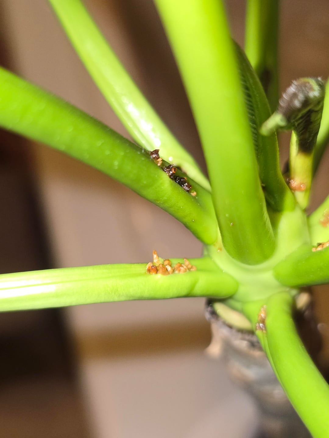 友人が、プルメリアの切り抜きを袋に入れて持ってきてくれました。マウイ島で購入でき、本土に持ち帰るのは合法です。 かなり順調に進んでいますが、今日、硬い小さな塊があることに気づきました。虫ですか?簡単には外れません。濡れているように見えますが、実際は濡れていません。とても小さく、ボールペンのボールくらいの大きさです。