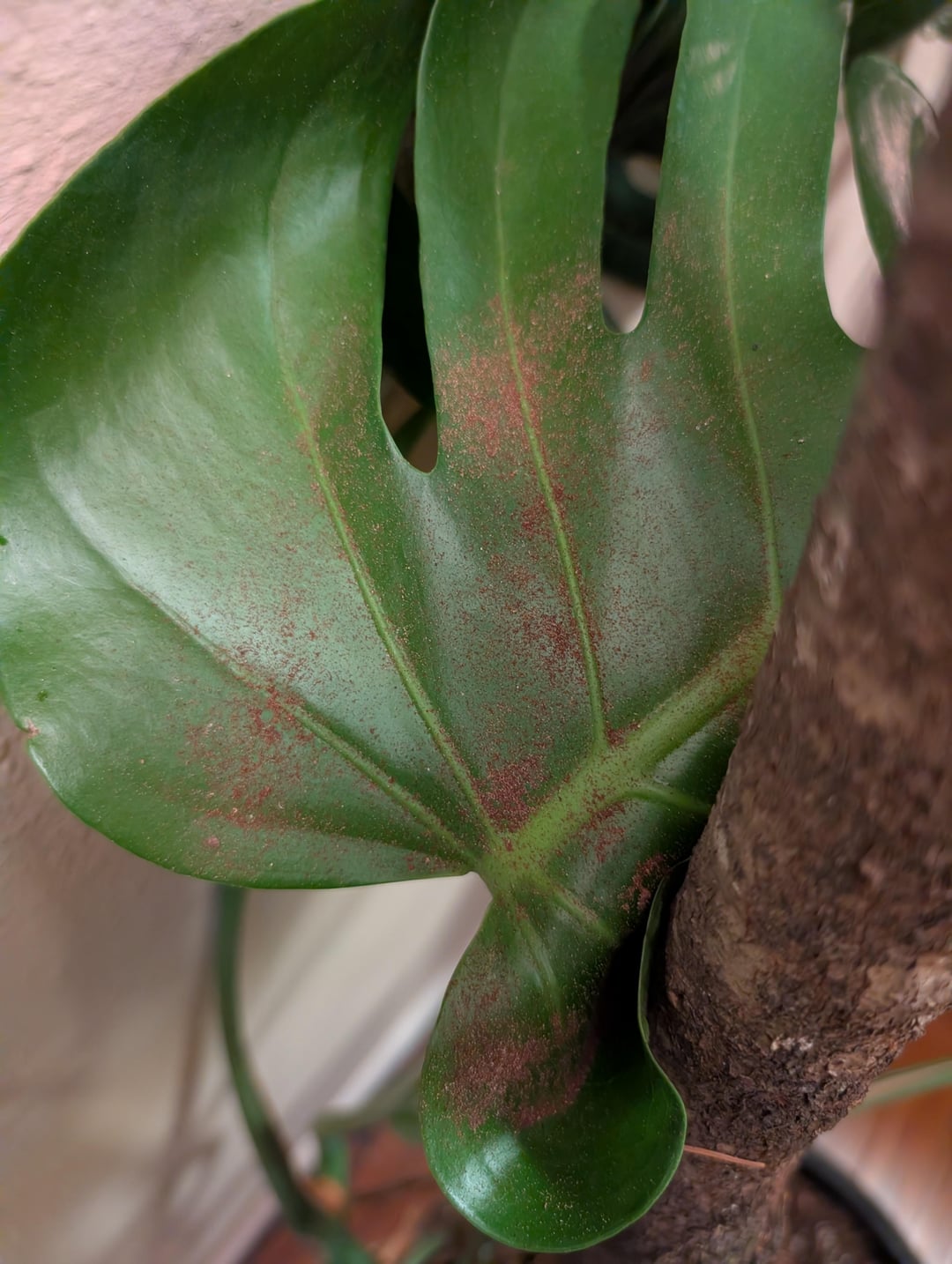 裏庭の枝を使ってモンステラをつるしてみました。何ヶ月もの間、葉の上におがくずのようなものが蓄積していることに気づきましたが、それは単なる樹皮の劣化だと思いました。ちょうど今日、枝にピンサイズの小さな穴がまだらにあることに気づきました。何かのつまらない虫だと思うのですが、何の種類か知っている人はいますか?