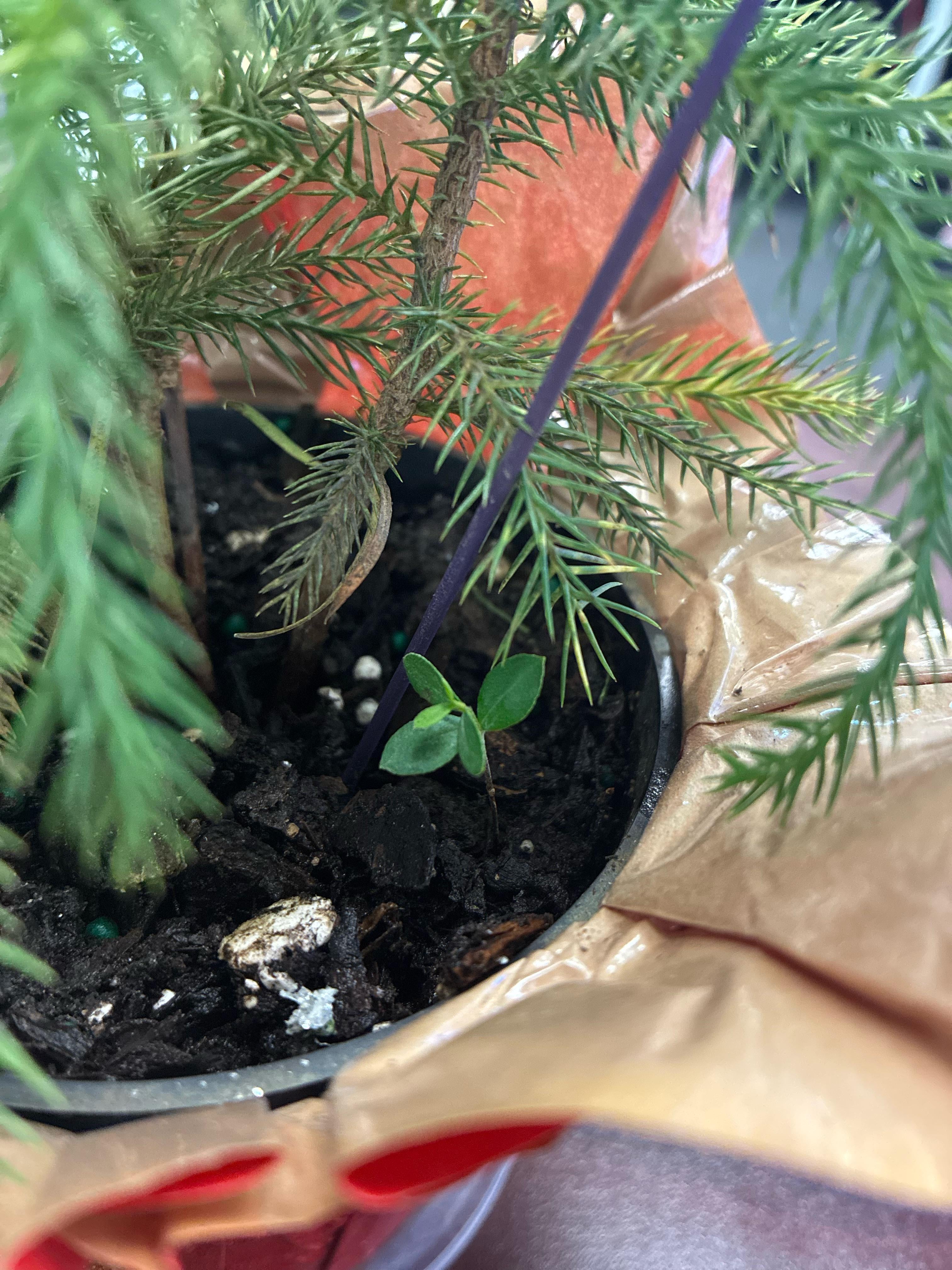 クリスマスにユージニアのトピアリーを買って職場の机に置いたのですが、ちょうどこの小さな芽が出てきたのが見えました。それが何か知っている人はいますか?