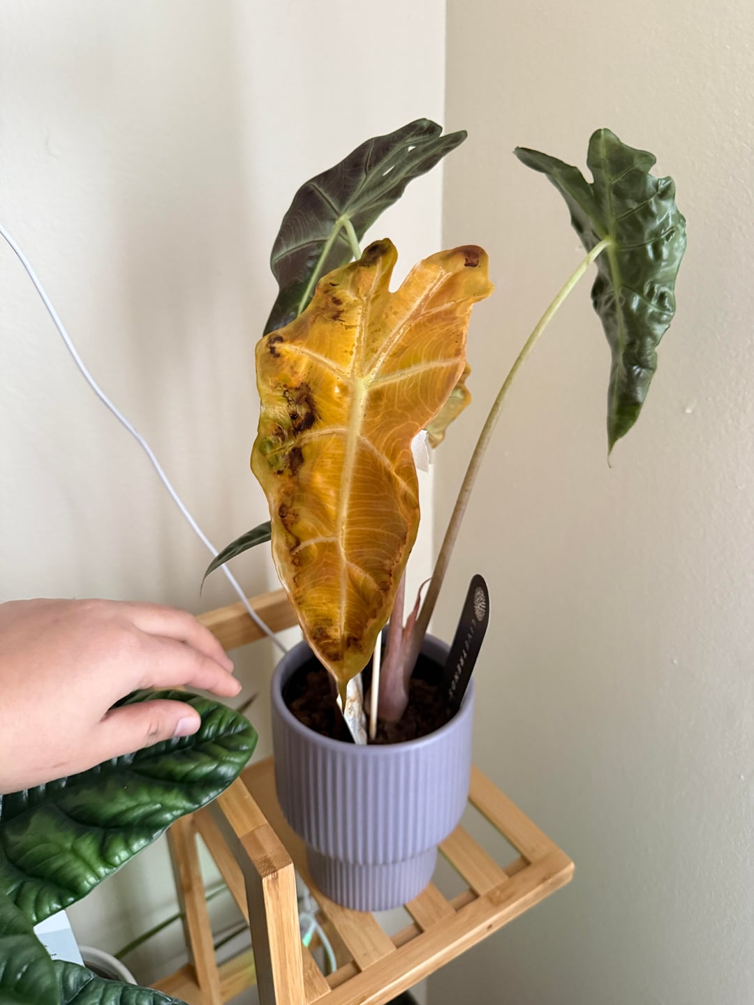 クワズイモは7月から育てていて、それ以来順調に育っていたのですが、冬の間一度水やりを忘れてしまい、2枚の葉が垂れ下がってしまい、2週間後にはこのような状態になってしまいました。葉を切り取るだけですか?どちらかの緑の葉に腐りが見られるので、他の葉に影響が出るのが怖いです