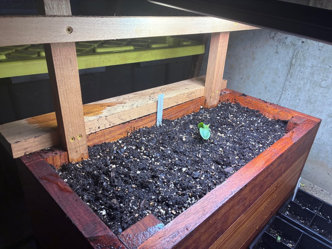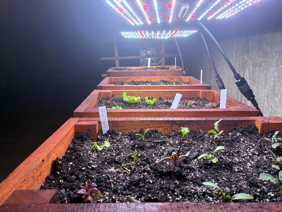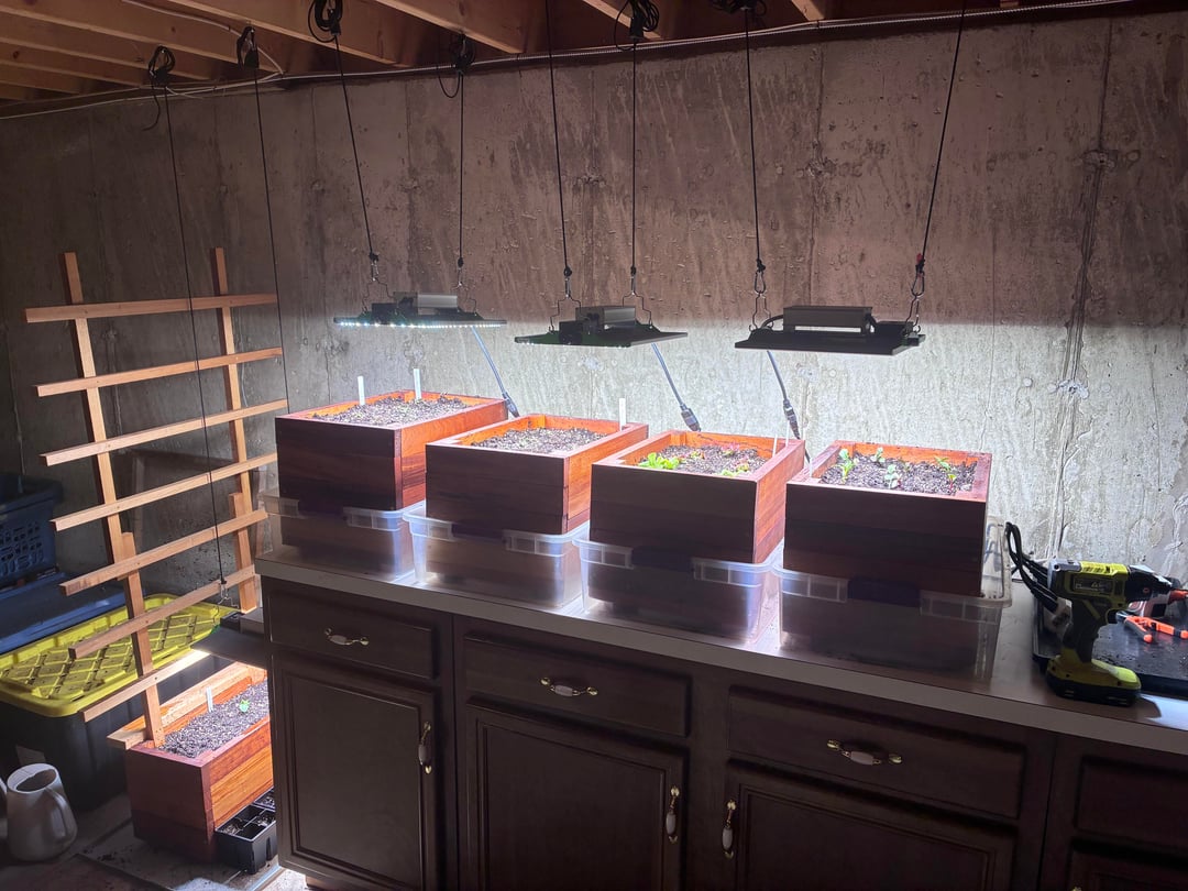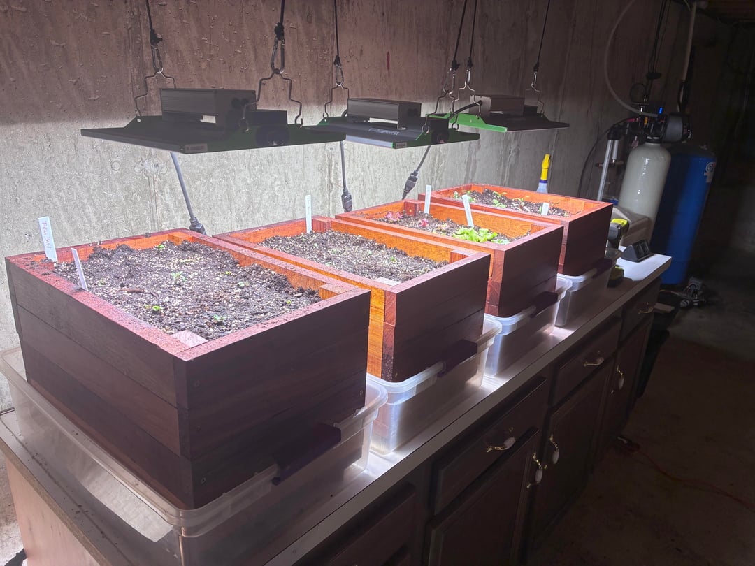 この冬、春の種まき用のスターティングライトを使用し、ミニレイズドベッドをいくつか作りました。今朝、苗を移植しました。