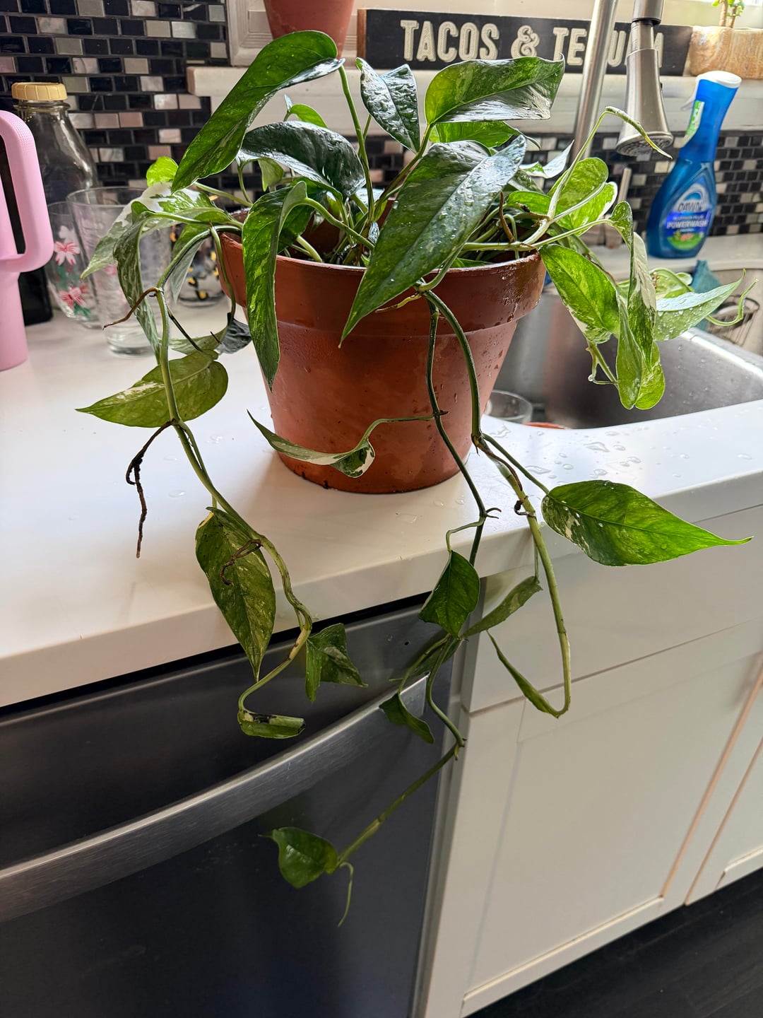 これはLowe’sで入手しました。素晴らしい価格。いつもは数週間待って植え替えるのですが、土の中から葉が生えてきているように見えました。それを取り出すと、これは狂ったように蔓を伸ばし、何度か自分自身に巻きつきました。