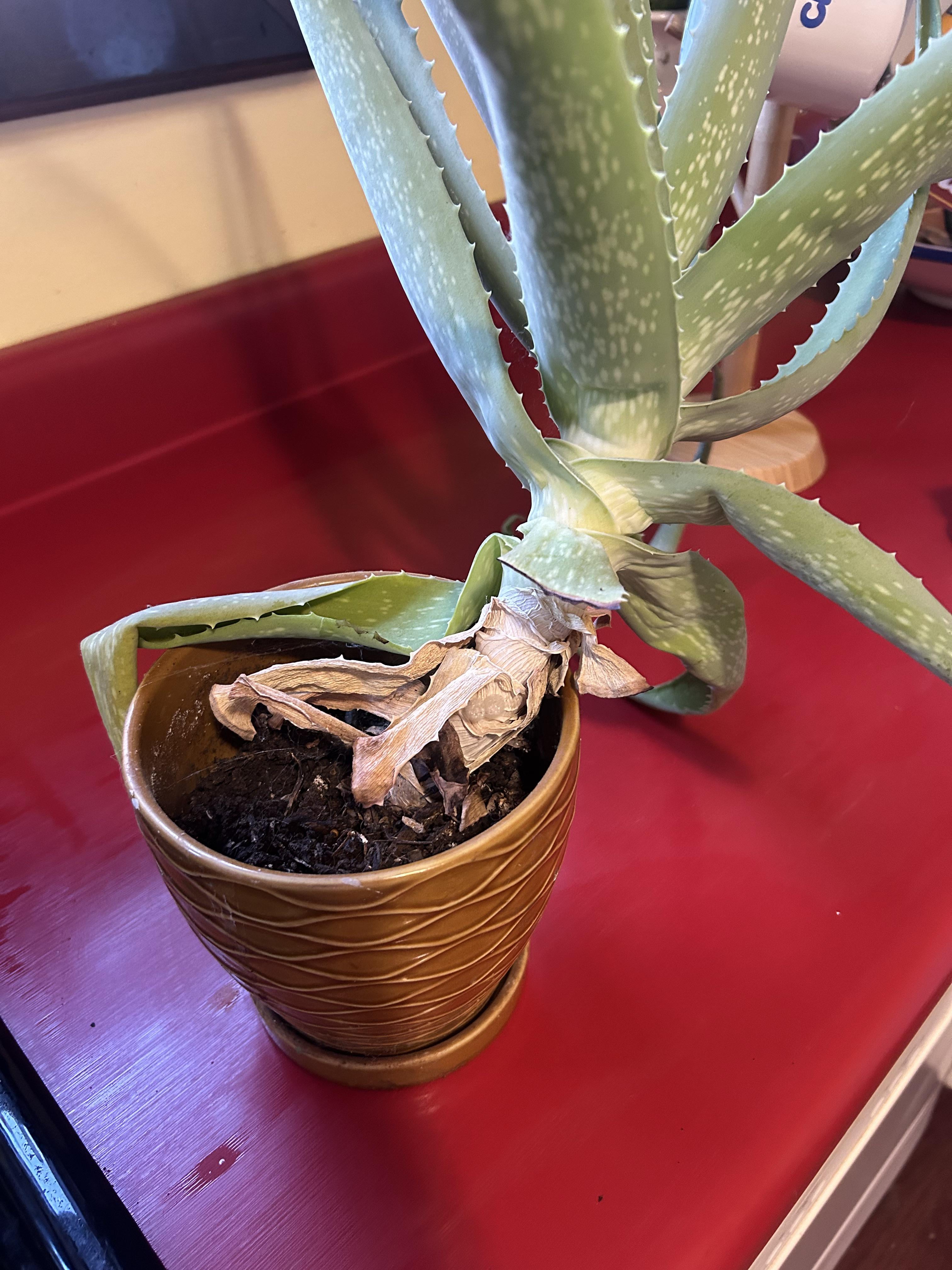私はこのアロエを約7年間飼っていますが、助けが必要です。取り出して、土を入れた大きめの鉢に植えてもいいでしょうか?ただこの子を傷つけたくないんです。下の部分が枯れているように見えますが、切り取ってもいいでしょうか?
