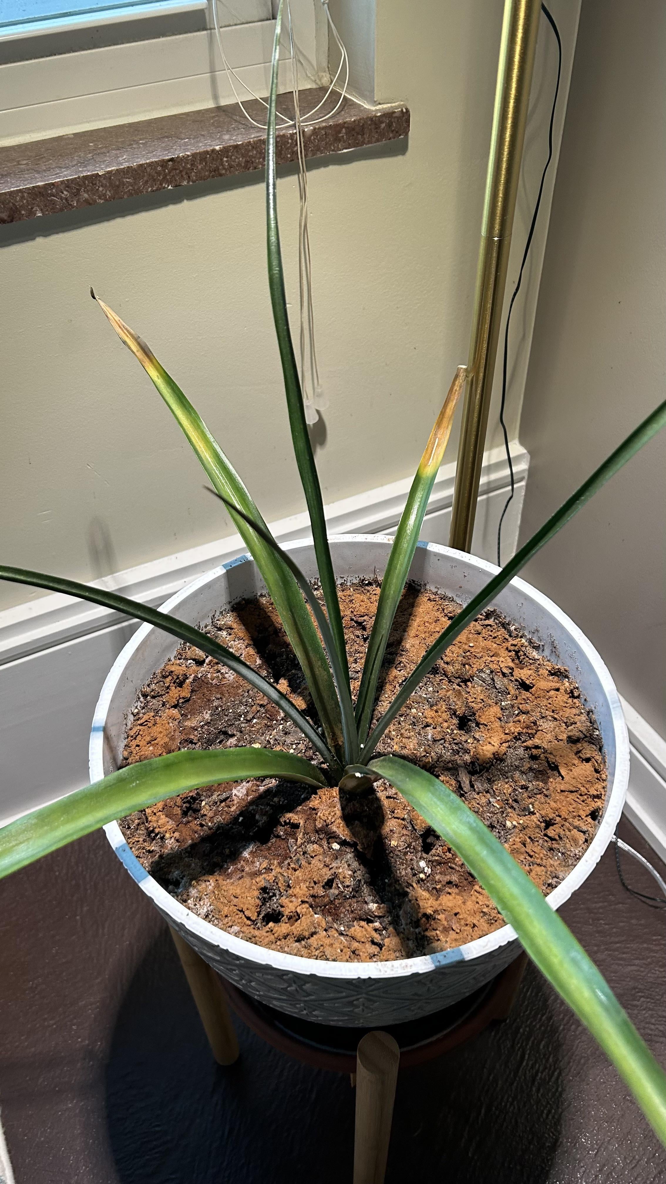 私はこのパイナップルの苗を 3 年ちょっと育てています。最近、葉の先、特に外葉が茶色くなり始めました。考えられることはすべて試してみましたが(水やりが多すぎたり不足していないか確認したり、肥料を与えたり、真菌の問題に備えて土にシナモンを加えたり、植え替えたりなど)、症状は悪化するばかりのようです。誰か私が試せることを知っていますか?休暇中にもらったパイナップルから植えたものなので、それを失うととても悲しいでしょう。