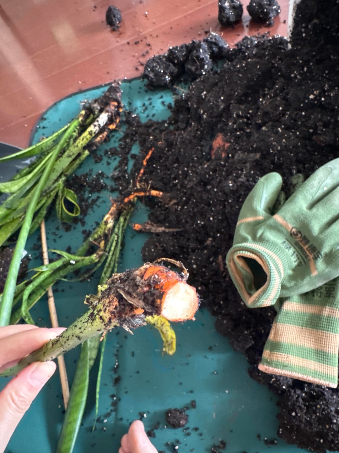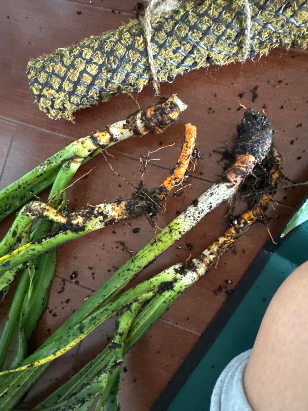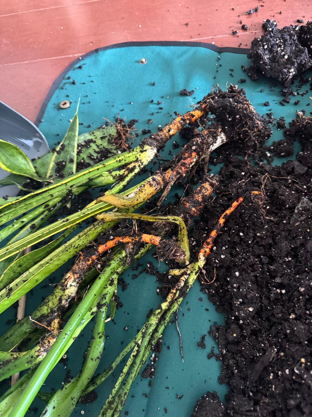 今日、一枚の葉がひどく濡れて垂れ下がっているのを見つけて、水のやりすぎであることに気づきました。垂れ下がった根を取り除き、他の根もチェックしました。他のものはまだしっかりしていますが、以前よりもはるかにオレンジ色になっています。これらはねっとりしていたり、臭かったりしません。もう一度植え替えるために乾燥させています。次のステップは何ですか?まだ大丈夫ですか?