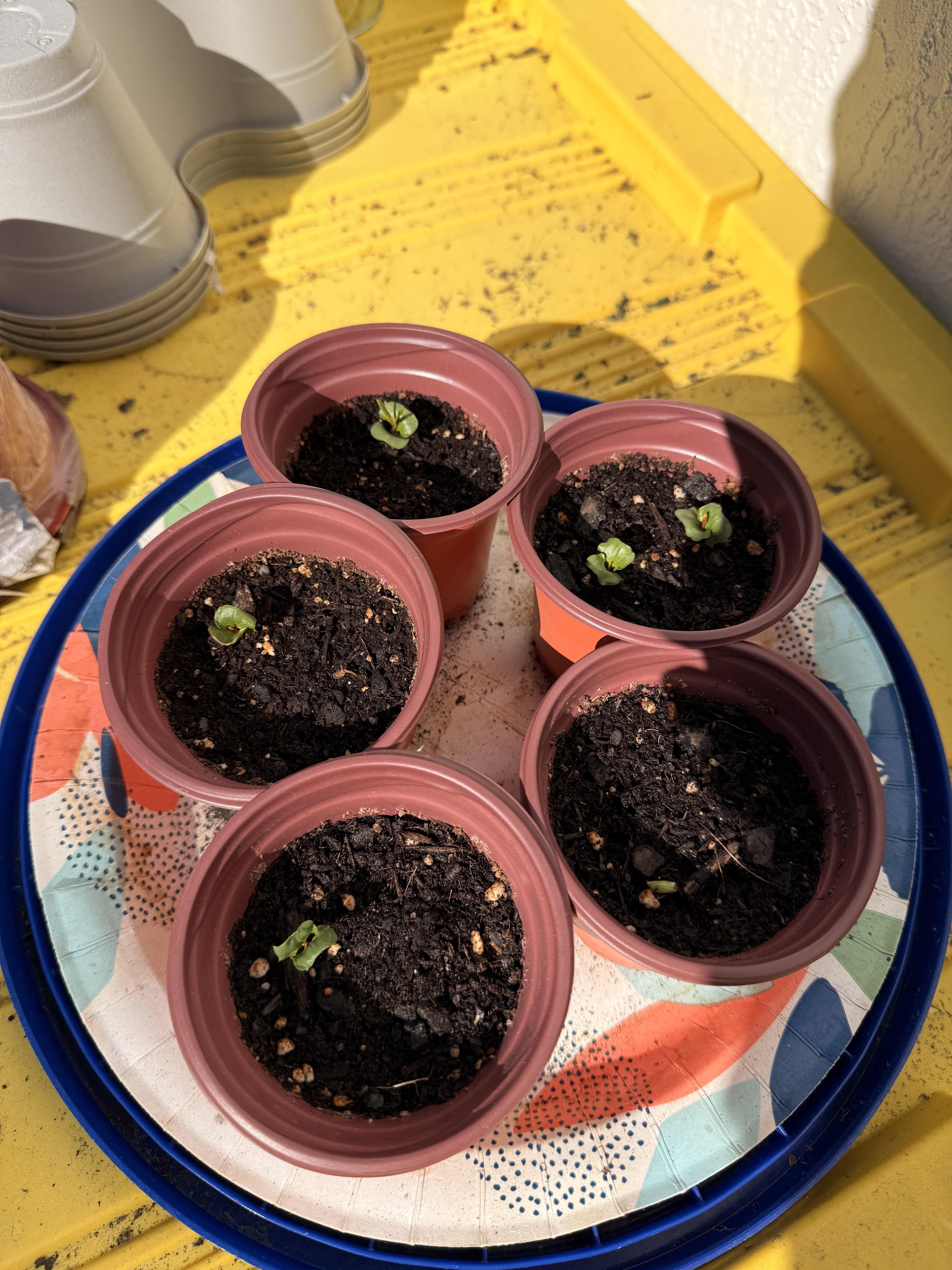 私と祖母は一緒にガーデニングの旅を始めました。彼女は勝っていますが、彼女は品種を購入しており、私は妊娠し、何らかの理由で裏庭に耐えることができなかったので、種から育てた私の植物は枯れました。 Butttttt 最近ザクロの種をやり直しました。 10本植えてみた!とても大好きです😭
