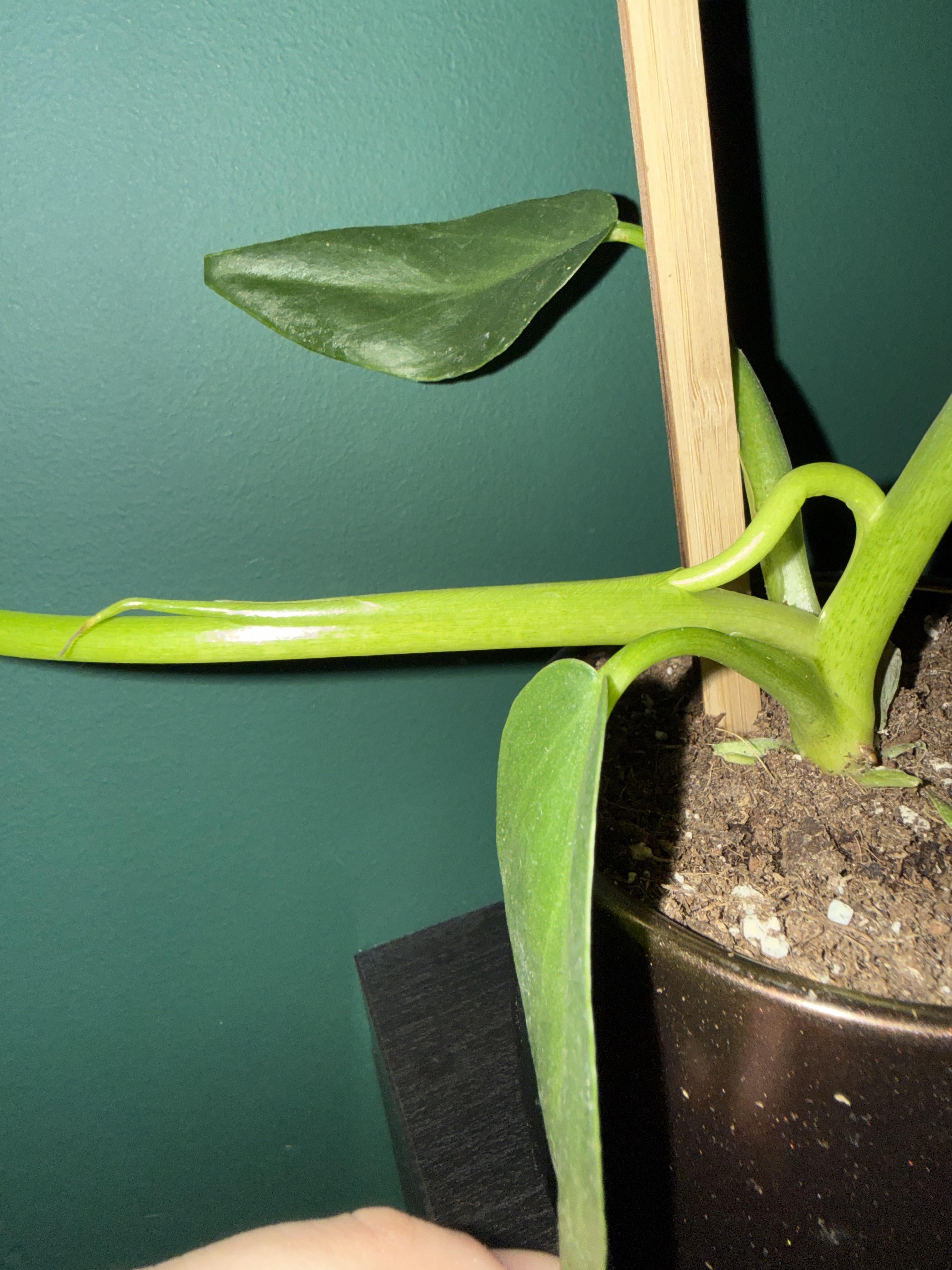 この新しく発達した葉は別の茎に成長しました。これを何とかしたほうがいいのか、それともこのままにしておくべきなのかわかりません。茎に見えるねじれは日に日に悪化しています。