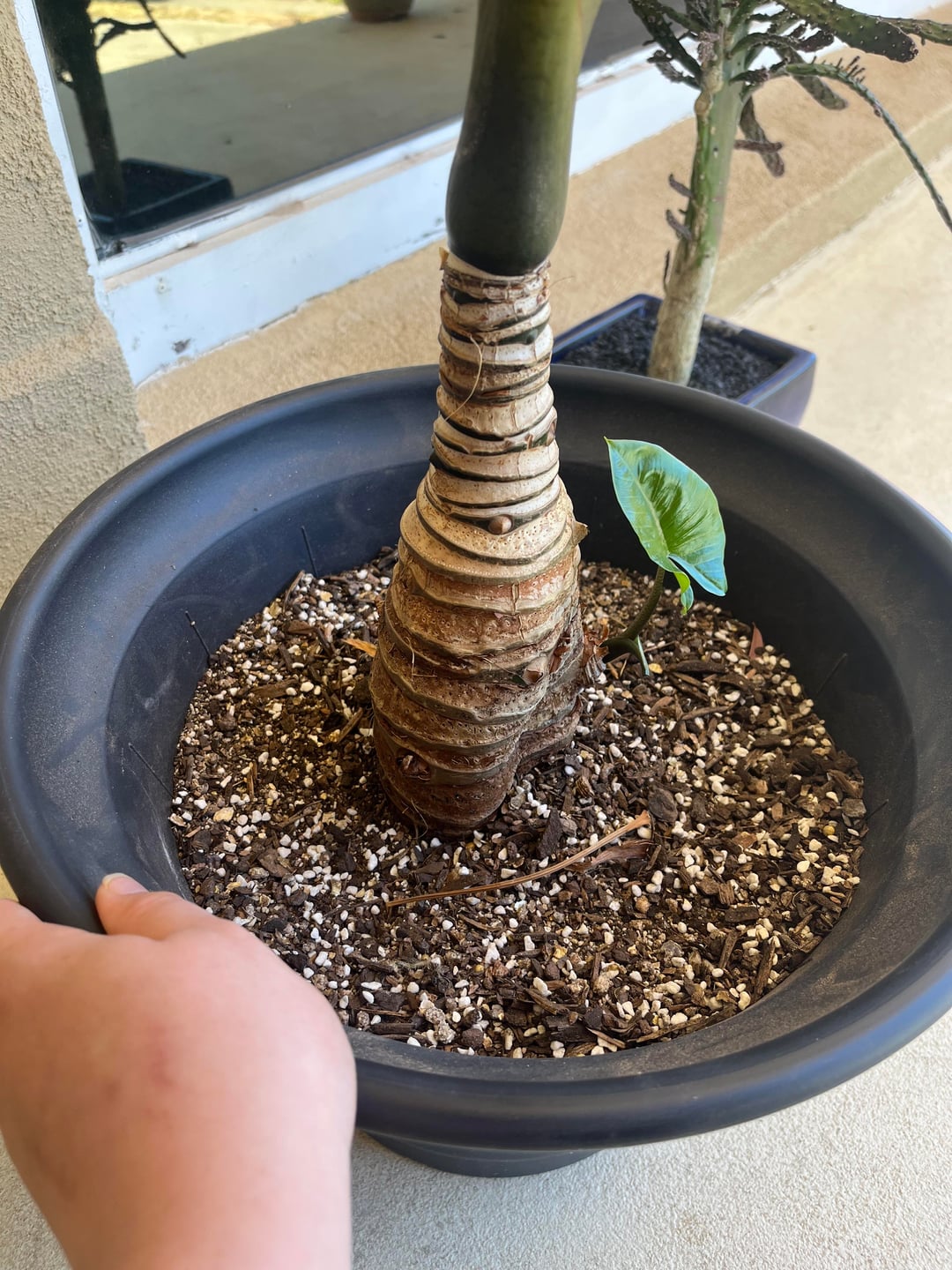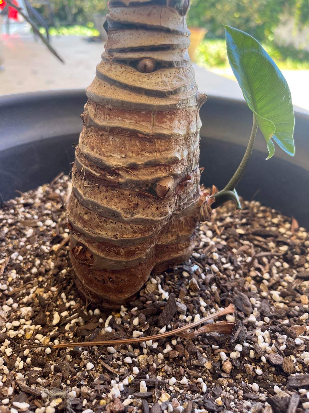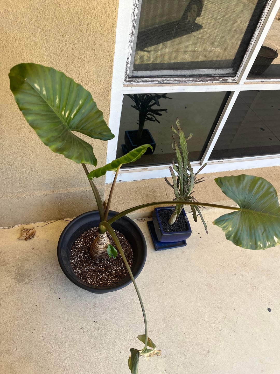天気が暖かくなり始めたので、この象の耳を外に移動させたところ、象は気に入ったようで、この小さな子犬まで飛び出しました。しかし、この陥没に気づきましたか?球茎の中にいますが、それが私が置いている場所が日当たりが良すぎるためかどうかはわかりません(午後4時頃から日没まで西の完全な太陽が当たります)。 1年ほど植え替えをしていなかったので、球茎が露出しすぎたのかな?助けが感謝されるかどうかはわかりません、ありがとう:)
