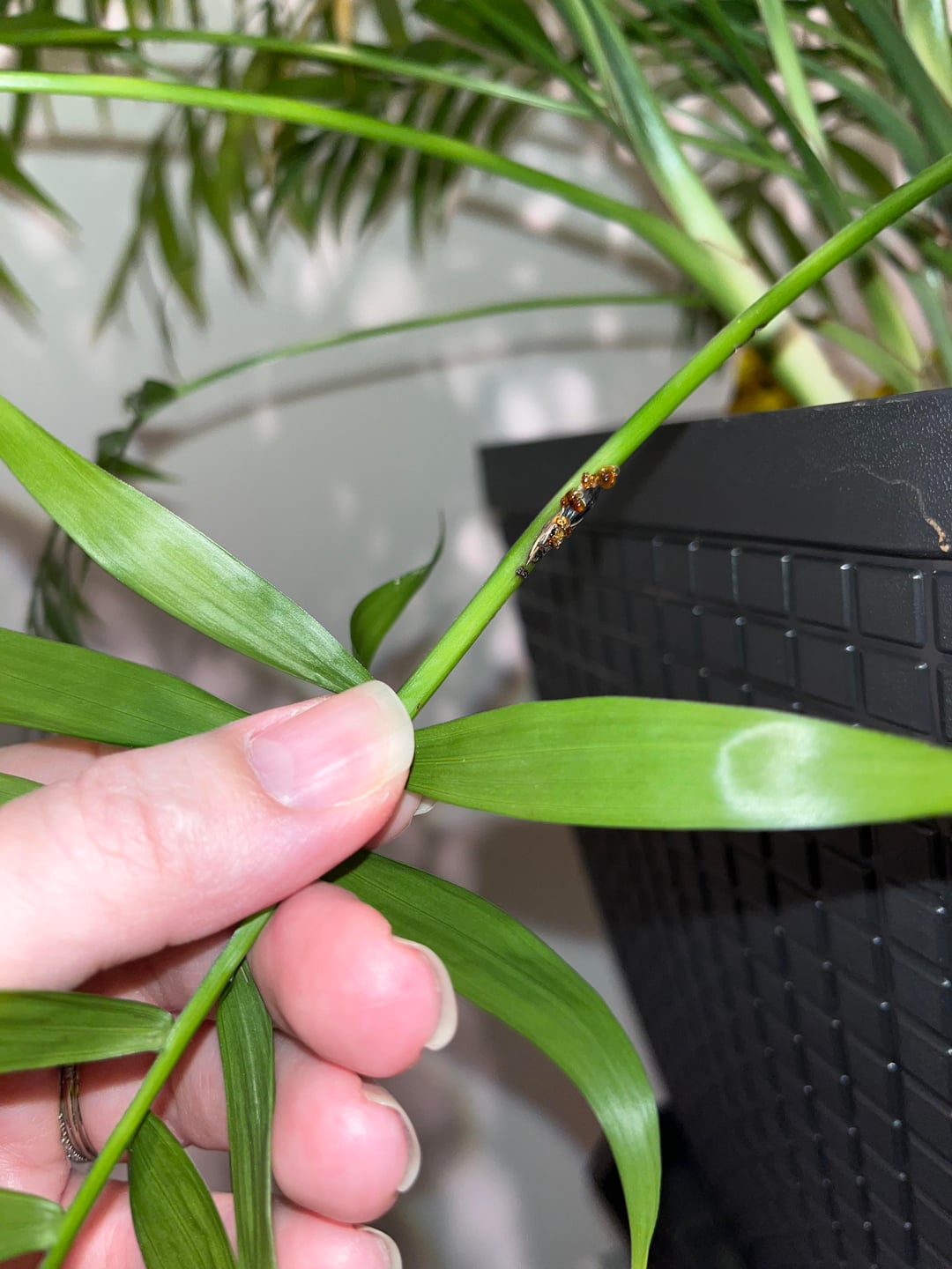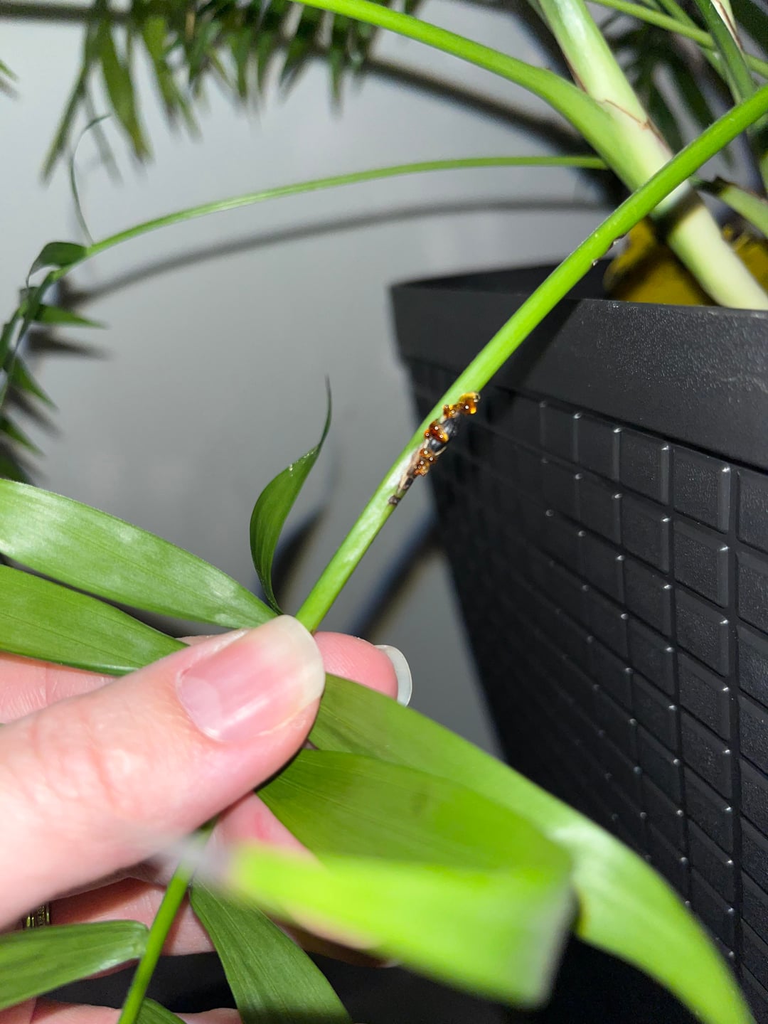 枯れたヤシの葉をいくつか切り取っていたとき、手のひらにこの奇妙な樹脂/成長物を見つけました。これが何なのか知っている人はいますか?何かアドバイスはありますか?他に卵や他の成長の明らかな兆候は見当たりません。