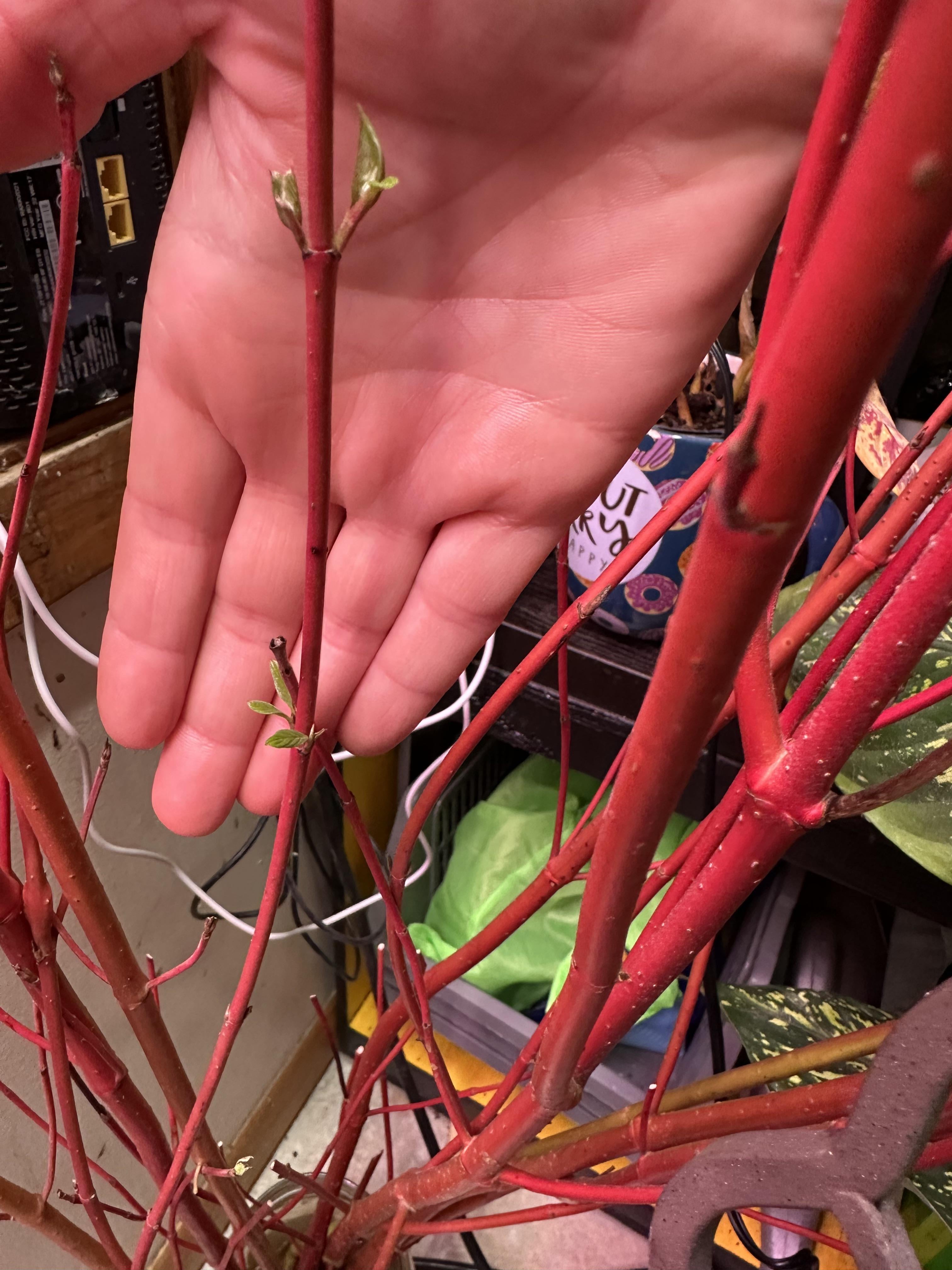 クリスマスの少し前に、私は季節の装飾としてハナミズキの束と柳の束を購入し、水の入った瓶にそれらを放り込みました。大型量販店で購入したので、根が生えるのか、それとも根が生えるのを防ぐための処理がされているのかが気になりました。さて、今日は素敵な緑の新芽を見つけました。これは良い兆候です。
